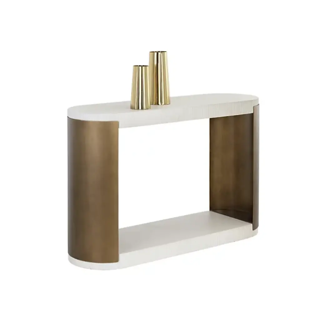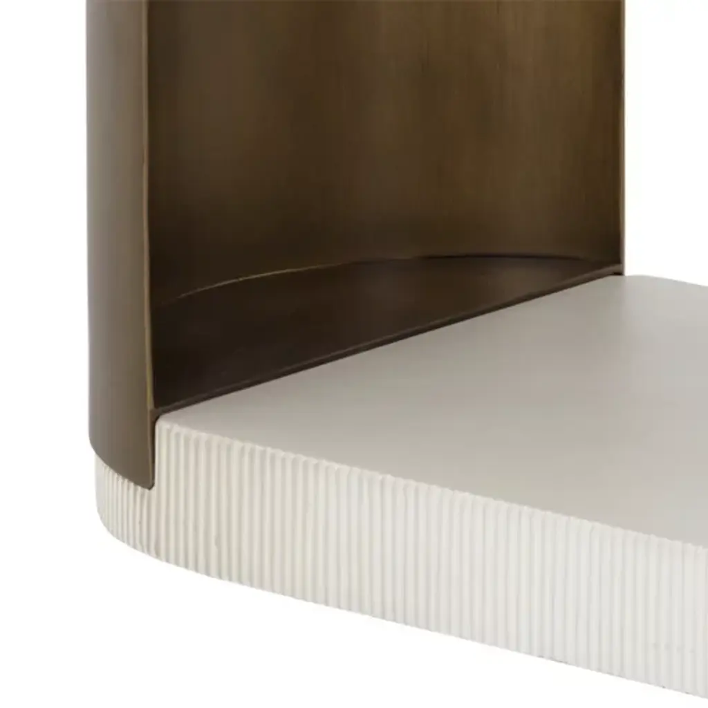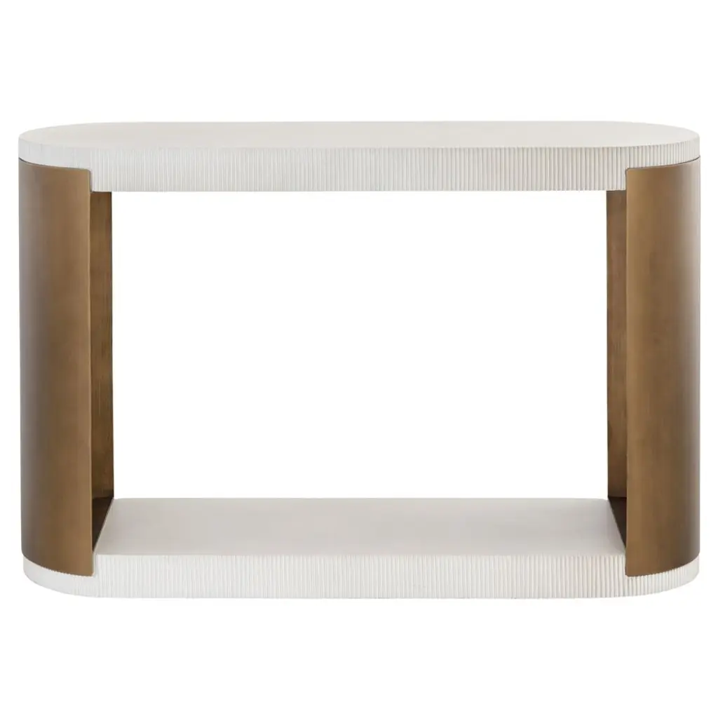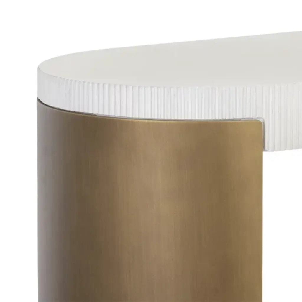 The Cavette Console Table from Sunpan blends old-world influence with a feminine flair, radiating opulence in any setting. It showcases a ridged white concrete top and base elegantly framed by brass steel. Crafted from a natural concrete mix, each piece boasts unique variations in color, texture, imperfections, surface scratches, and non-structural hairline cracks, contributing to its distinctive character. Suitable for indoor and covered outdoor spaces, this table combines durability with timeless elegance, making it a statement piece for any decor.