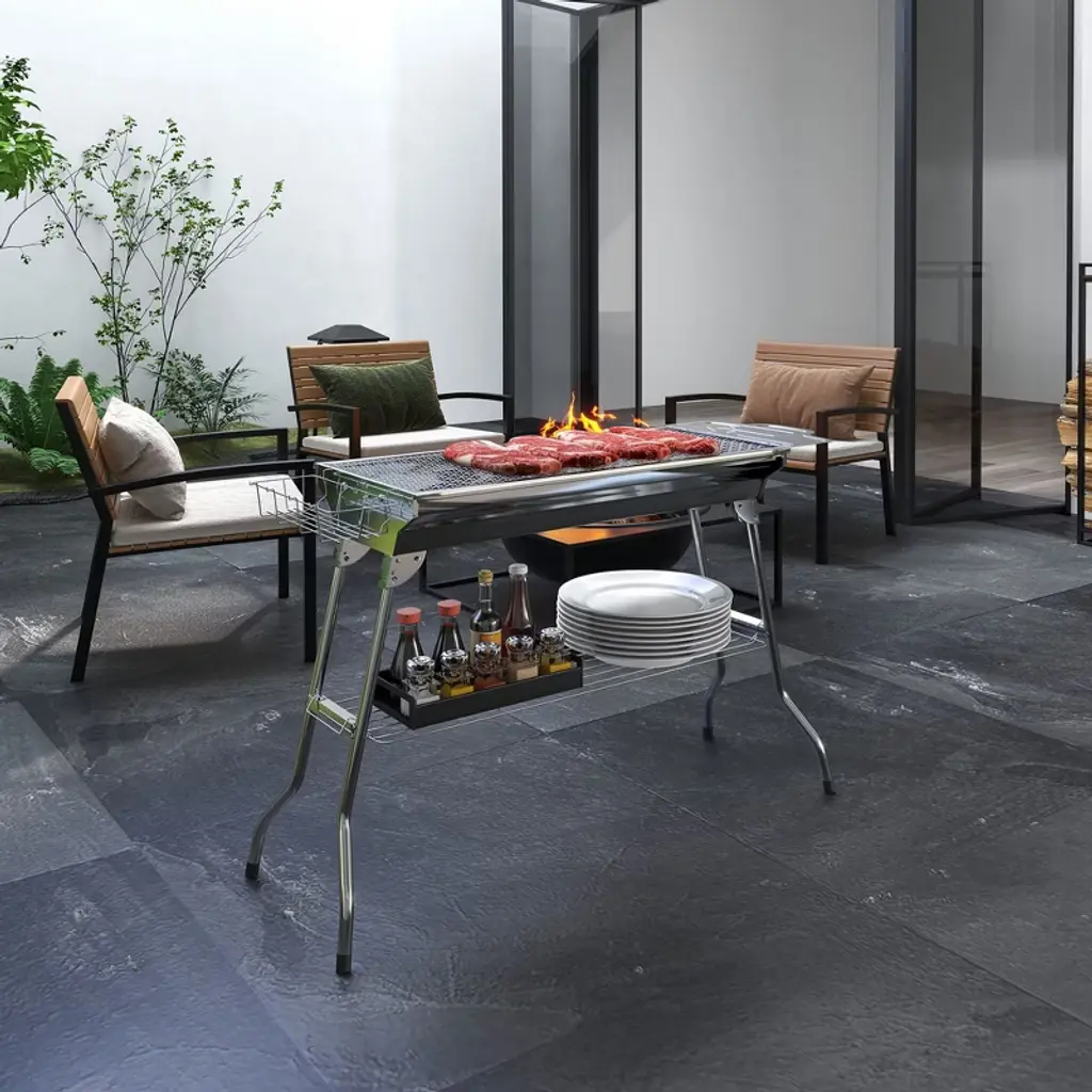 This portable charcoal grill is designed for easy transport and storage—large enough when needed and compact enough to fit in your car for camping, tailgating, and other outdoor adventures. It features ample storage, including a bottom shelf for charcoal, two alloy plates for seasonings, hooks for utensils, and a side basket for ingredients. The grill comes with a food-grade, non-stick pan and grill grate, both highly heat-resistant, perfect for cooking hibachi-style dishes, yakitori, steaks, burgers, corn, and more. Adjustable air vents at each end allow precise temperature control, enhancing flavor and cooking consistency. Crafted from durable stainless steel, this grill is weather-resistant, abrasion-proof, and warp-resistant—ready to withstand all your outdoor cooking needs.