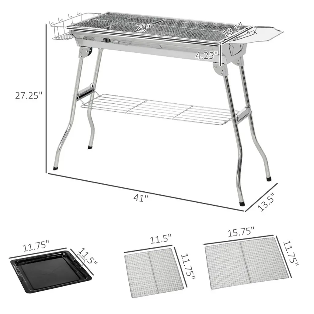Cavinas 29" Portable&foldable Outdoor Charcoal Grill,stainless Steel Bbq Griller With Pan,grill Rack&hooks For Camping,picnic,party,silver