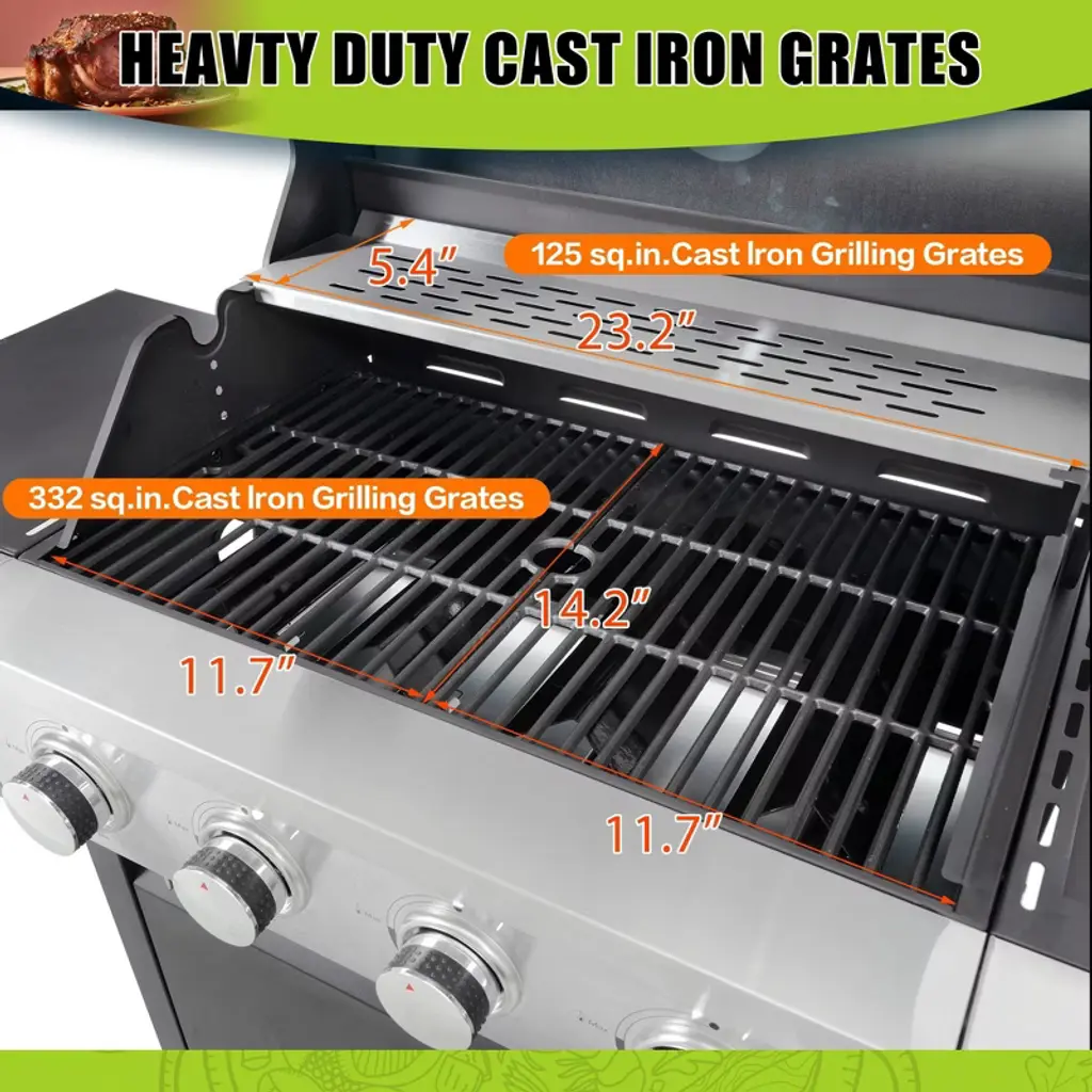Elevate your outdoor cooking game with this 4-burner propane grill, delivering a powerful 46,500 BTU output for quick, efficient cooking. Featuring advanced electronic pulse ignition, it ensures a fast and hassle-free start with just a click, eliminating the need for manual ignition. The grill’s independent burner controls allow precise heat management, ideal for cooking a variety of dishes like steaks, vegetables, and seafood. The stainless steel lid and control panel offer durability, corrosion resistance, and a sleek, high-end appearance, while the black lacquered cabinet adds a modern touch to your patio setup. The built-in thermometer ensures optimal heat control, ensuring perfect cooking every time. With a side burner included, this grill is perfect for preparing side dishes or sauces while grilling.