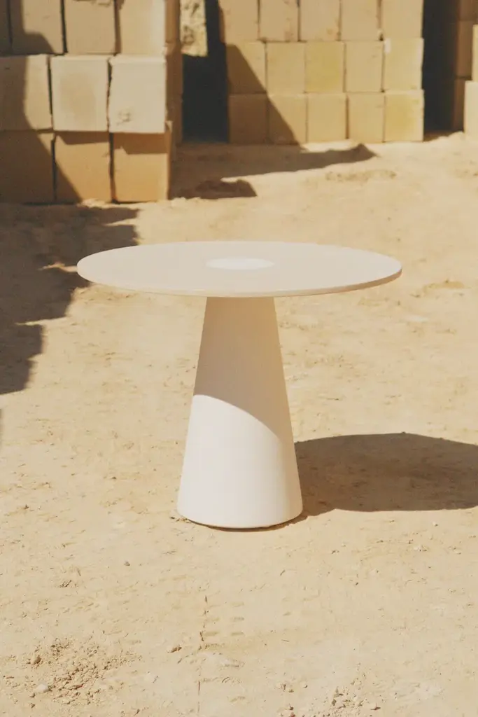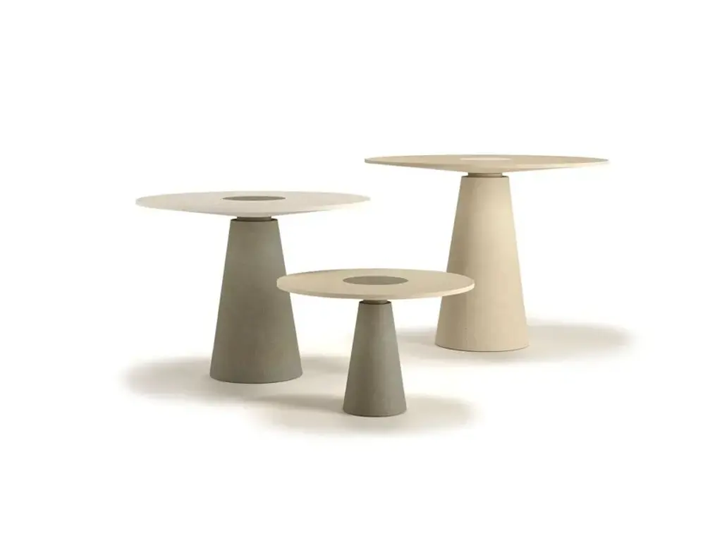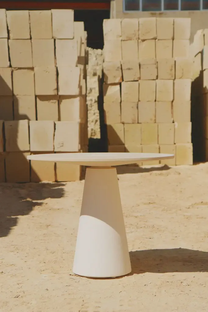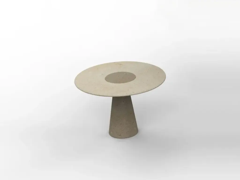 Centro 30 is a table made of Lecce stone, characterized by a minimal design that contrasts the base and the top through opposing diagonal lines. The material enhances compositional flexibility, allowing the three sizes and types of tables to be modified and to interchange the color in polished Lecce Stone.