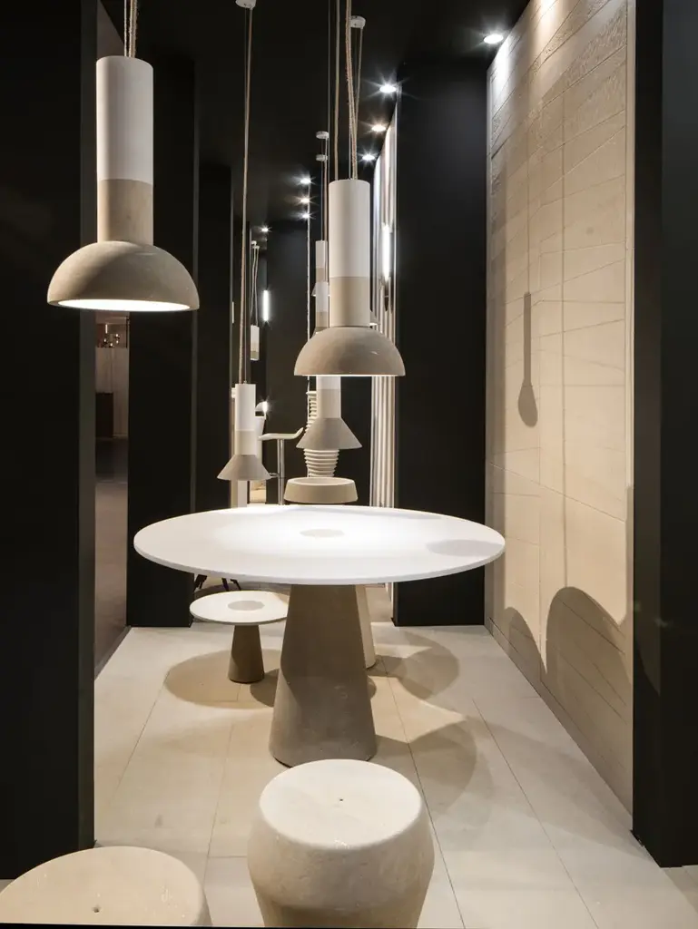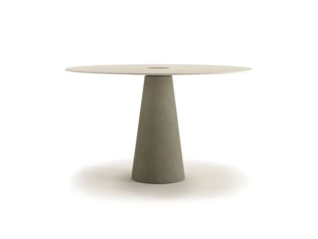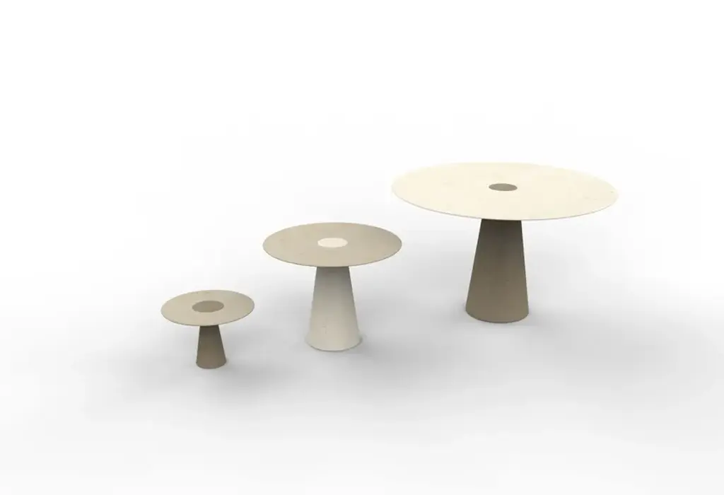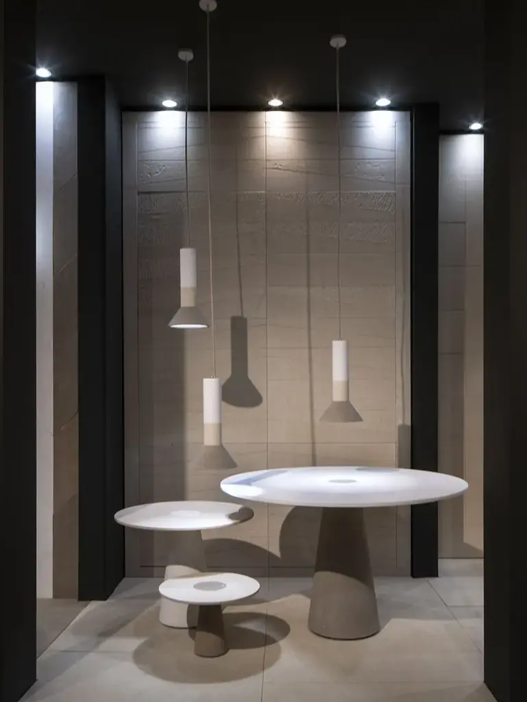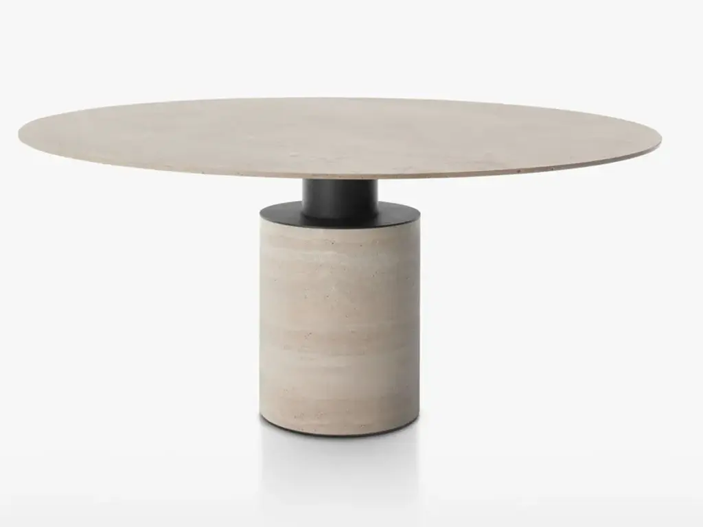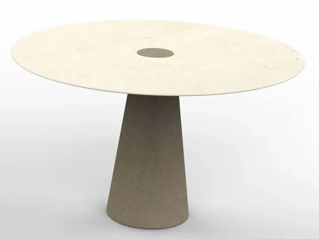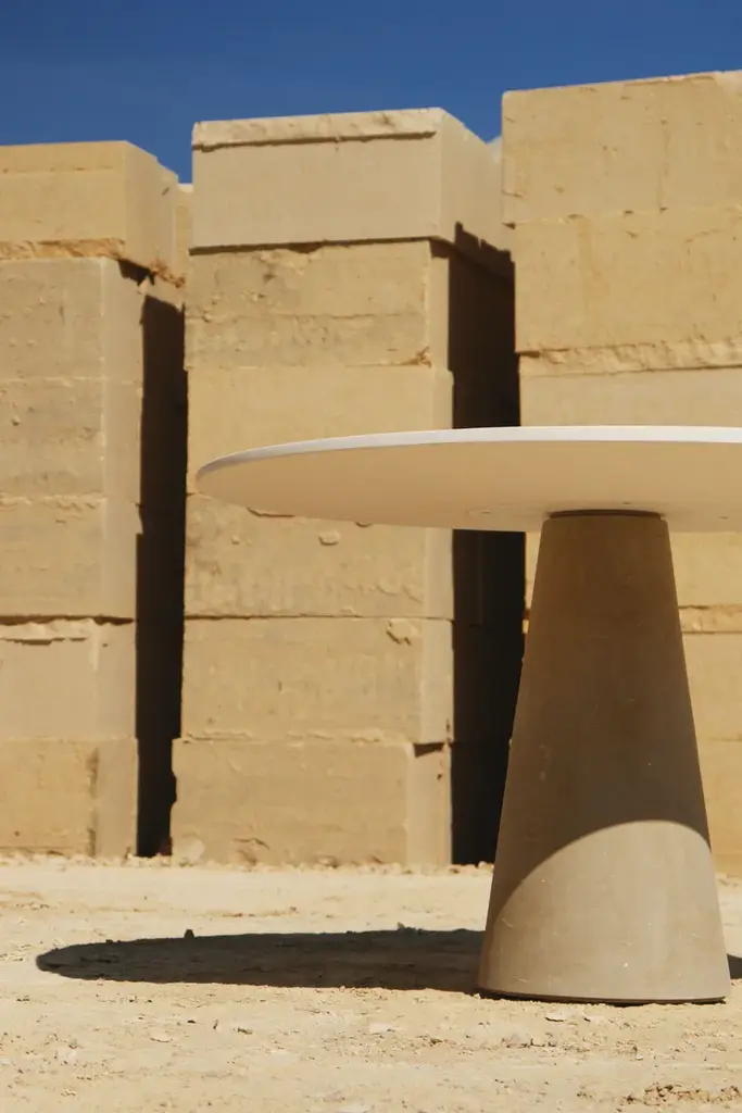 Centro 72 is a table made of Lecce stone characterized by a minimal design that contrasts the base and the tabletop, defined by slanted and opposing diagonal lines. The material enhances compositional flexibility, allowing the three dimensions and table types to modify and interchange the color of the polished Lecce Stone.
