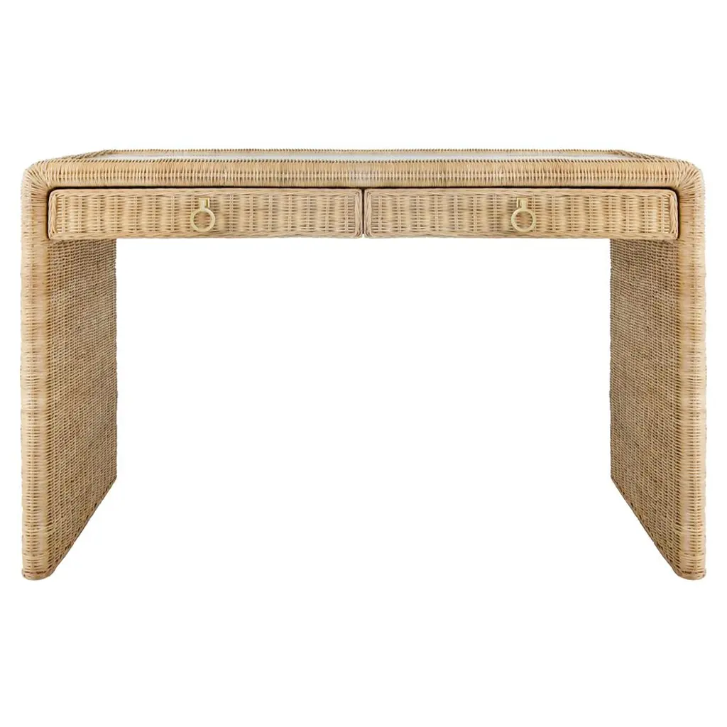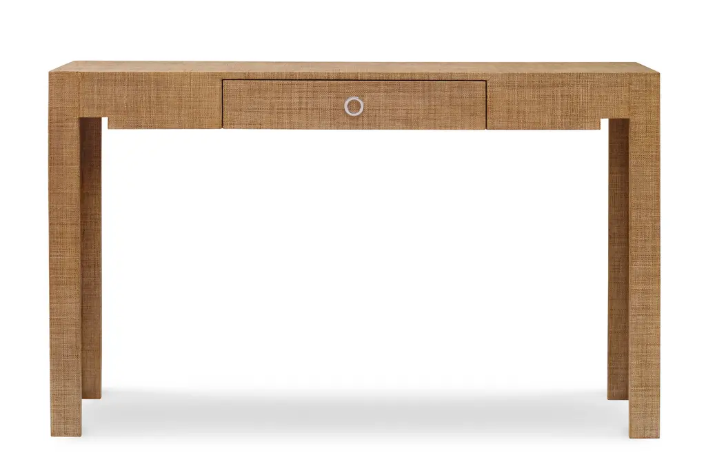 This piece is available only as shown, and will ship in 2-3 weeks. An elegant console table from the Century Furniture Purveyor Collection. Crafted of Mahogany Solids with Raffia. A single drawer with chrome plated hardware provides convenient storage. This purchase includes a 1/4" lay -on glass top.