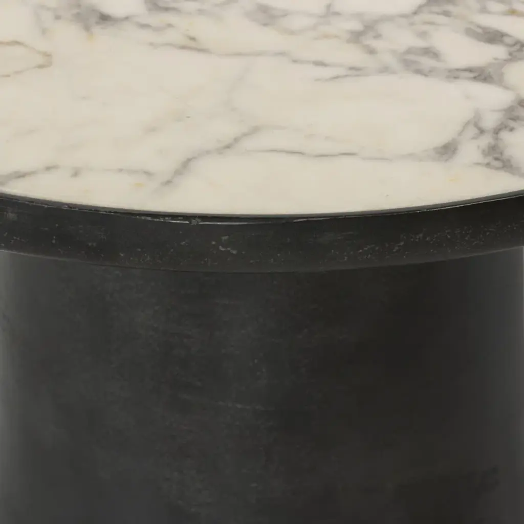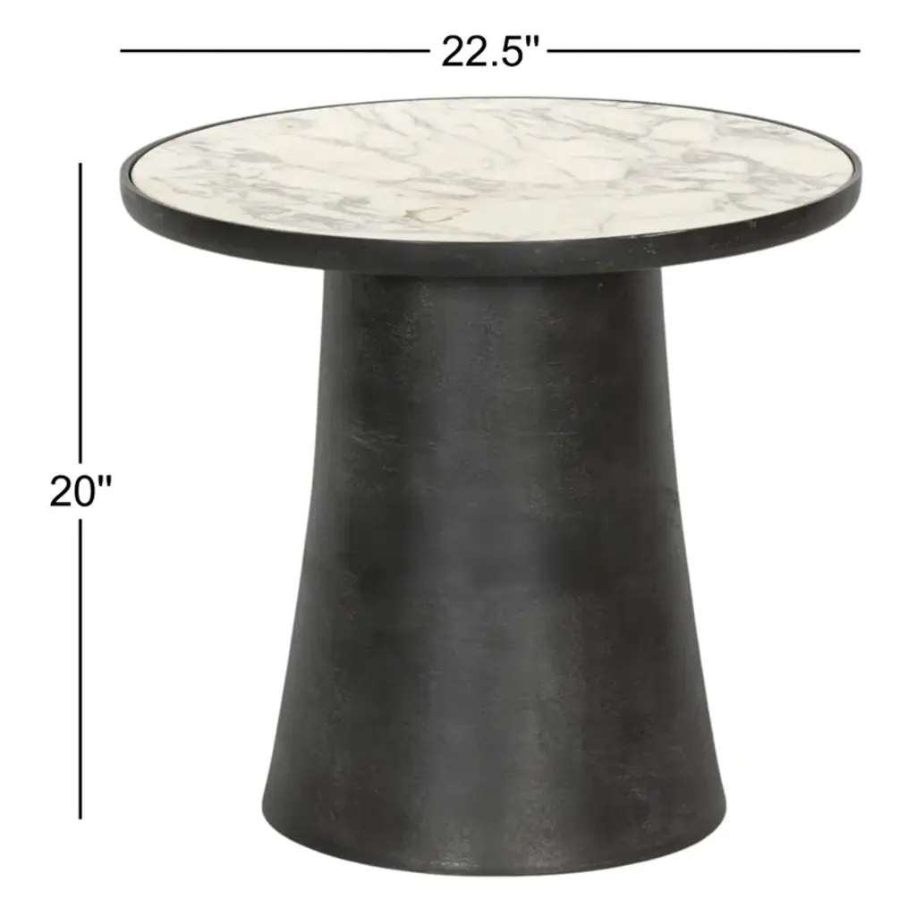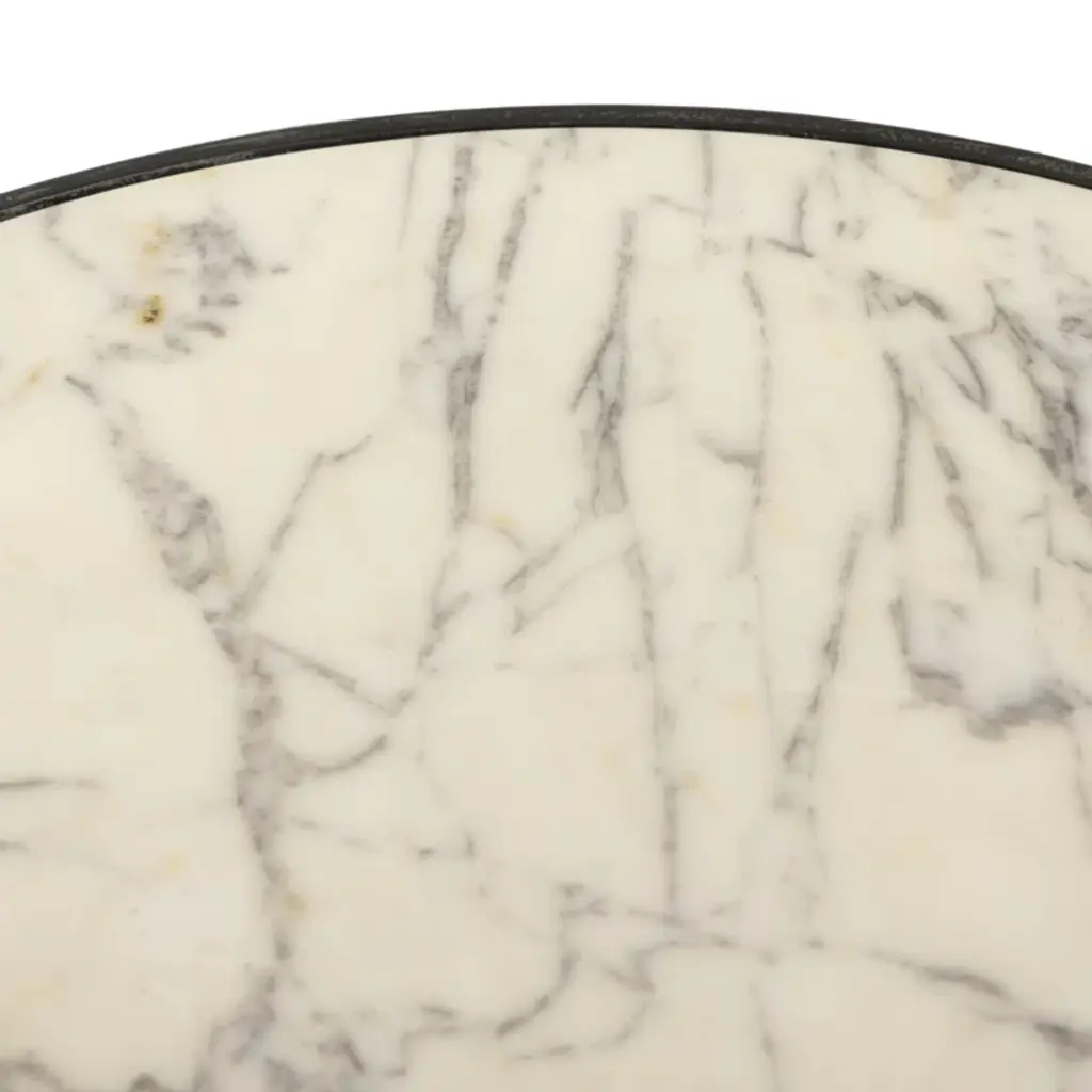 A base of gray-finished aluminum supports a rounded inset tabletop of white marble with beautiful natural veining to finish this outdoor table. Cover or store indoors during inclement weather and when not in use.