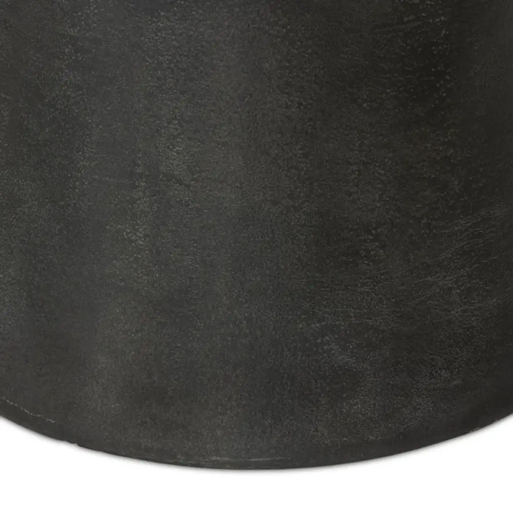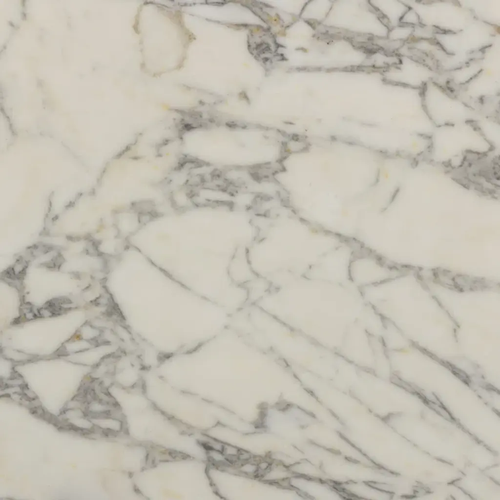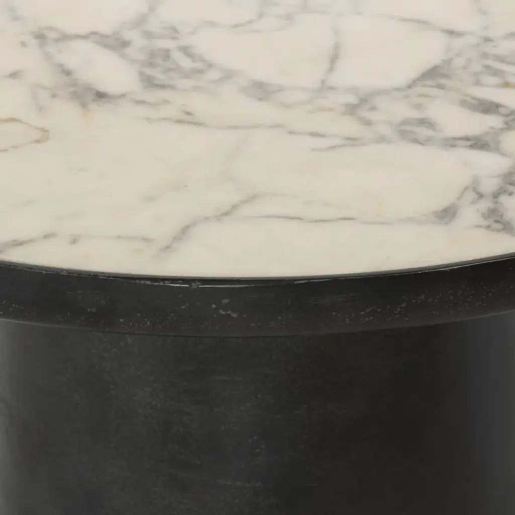 A base of gray-finished aluminum supports a rounded inset tabletop of white marble with beautiful natural veining to finish this outdoor table. Cover or store indoors during inclement weather and when not in use.