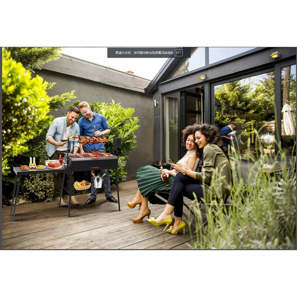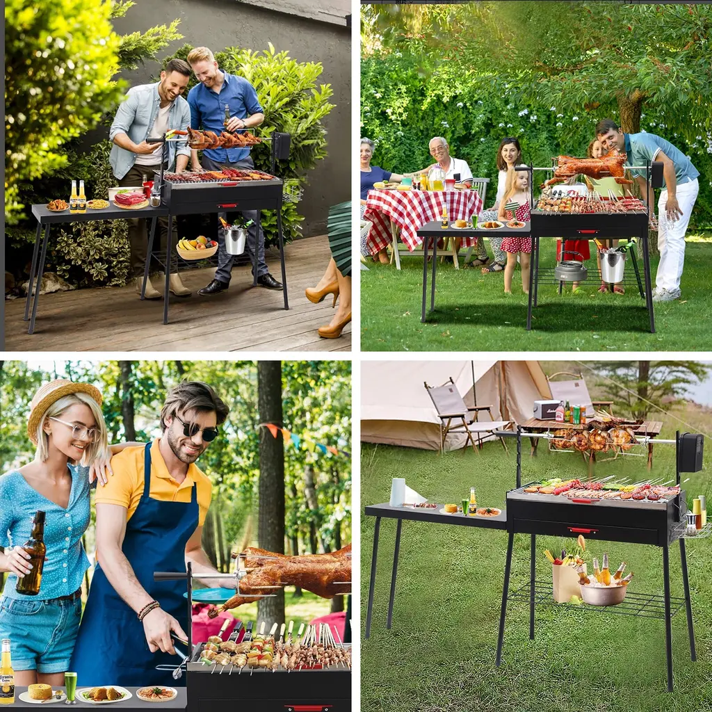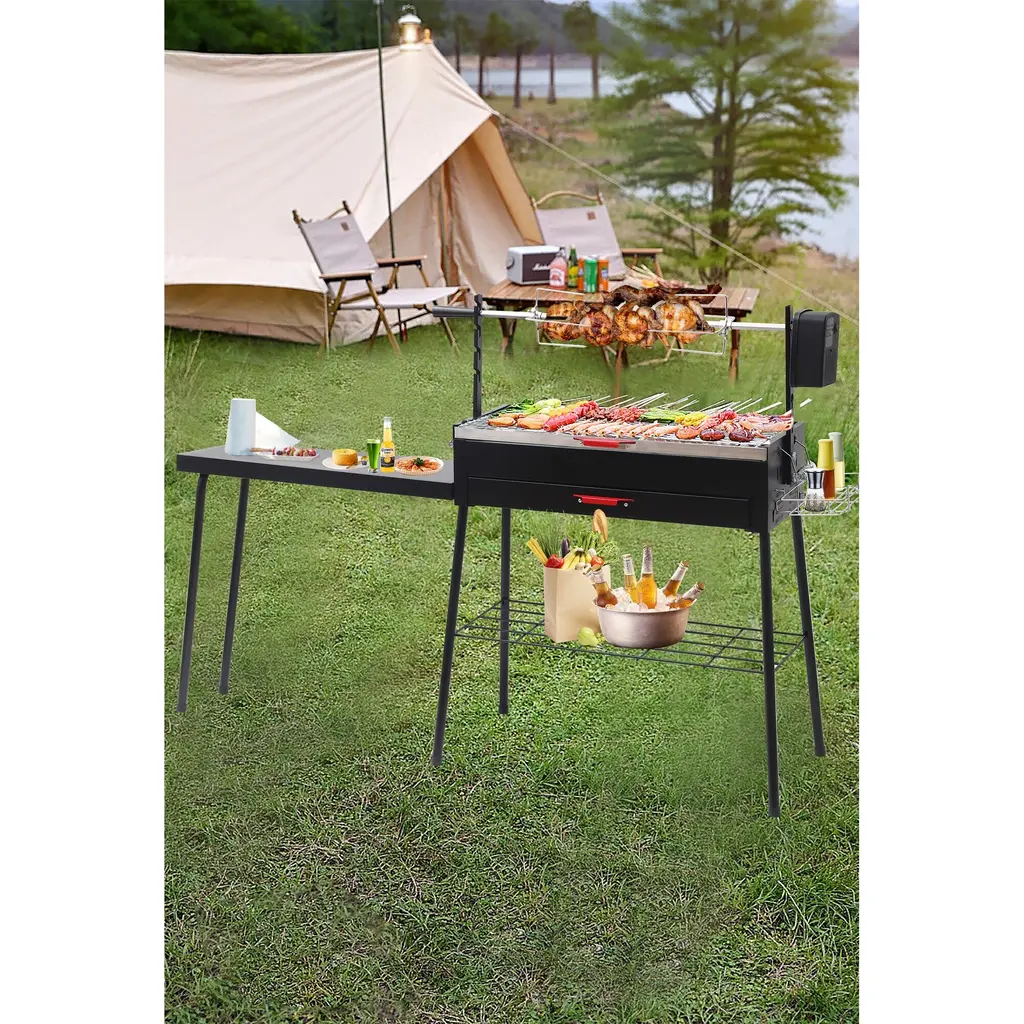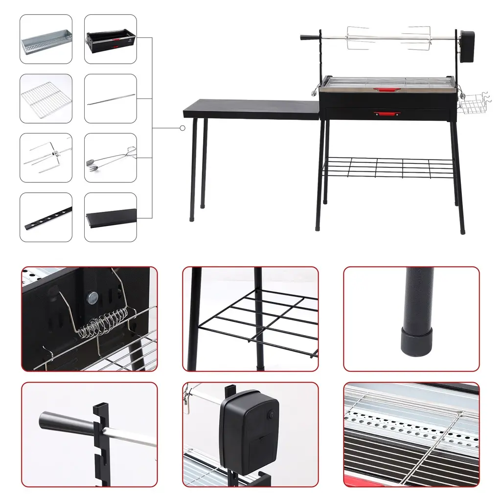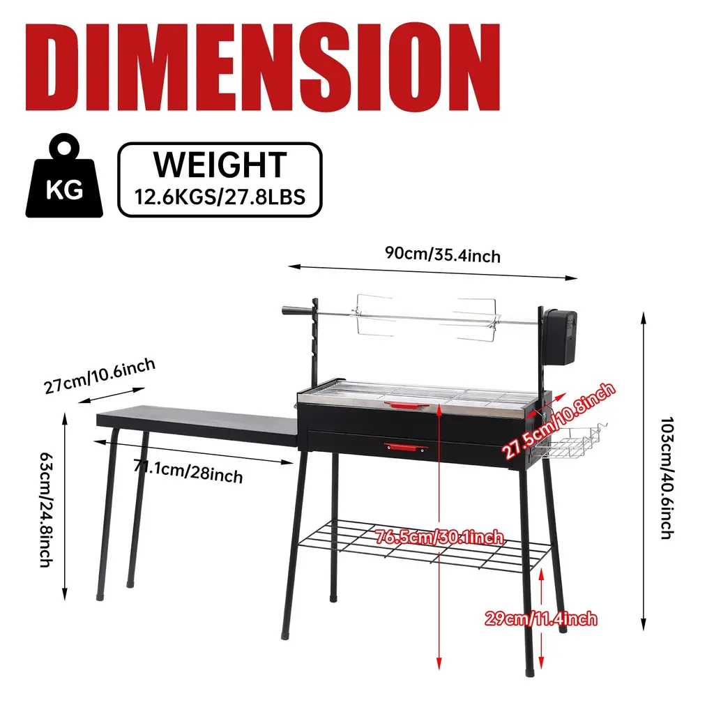 Convenient Rotisserie: Our grill comes equipped with a rotisserie powered by a D battery (battery not included), adding convenience and versatility to your cooking. You can enjoy evenly cooked meats without the need for manual turning. Removable Side Table: The detachable side table offers a convenient space to keep all your grilling essentials close at hand, making your cooking experience smoother and more efficient. The side table measures 28 x 10.6 x 24.8 inches (L x W x H). Generous Grilling Area: With a grilling surface measuring 35.4 inches in length and 10.8 inches in width, this grill offers plenty of space for cooking a variety of foods. Whether you're grilling vegetables, chicken drumsticks, beef steaks, kebabs, or more, it’s perfect for family and friend gatherings. Included Features: This set includes a stainless steel grill, a detachable side table, an electric roasting fork, a storage shelf, and a foldable grill frame with a handle. Grilling tools and gloves are also provided for added convenience. Versatile Usage: Use the grill with its legs for a standing cooking position, or opt for a sitting position. You can also place the grill on another surface without the legs, offering multiple options for different cooking setups.