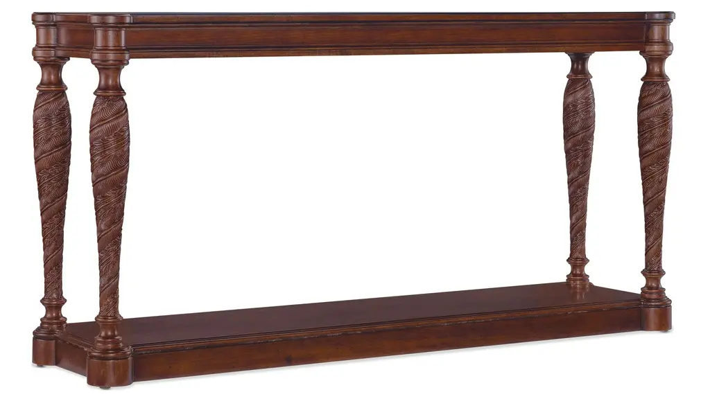 Inspired by the tropical craftsmanship of the West Indies and classic British and Dutch Colonial design periods, the Charleston Console Table has an intricate carved leaf motif on the shaped legs. With one fixed shelf, it is crafted of Cherry Veneers with a Solid-Wood Edge top and finished in the vibrant Maraschino Cherry using natural grain Cherry Veneers showcasing dramatic cathedral patterns in the wood. Finished on all sides so it can be floated in a room.