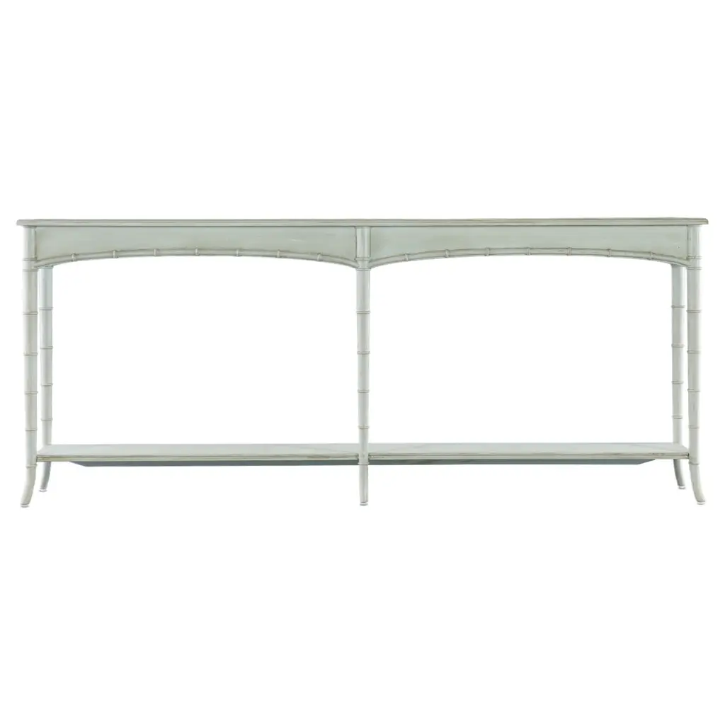 Capturing the vintage charm of the coastal South and the tropical craftsmanship of the West Indies, the Charleston Console Table is crafted of Maple Veneers and Resin with bamboo-motif accents and slender bamboo-style legs. Featuring one fixed shelf, it is finished in the charming Haint Blue, a soft blue color that can be found on the ceilings of porches and entryways, window shutters and doors of the South. The color is inspired by folklore brought to the American South more than 200 years to keep ‘haints’ or spirits, which could not cross water, from entering the home or dwelling.