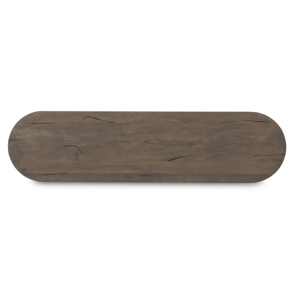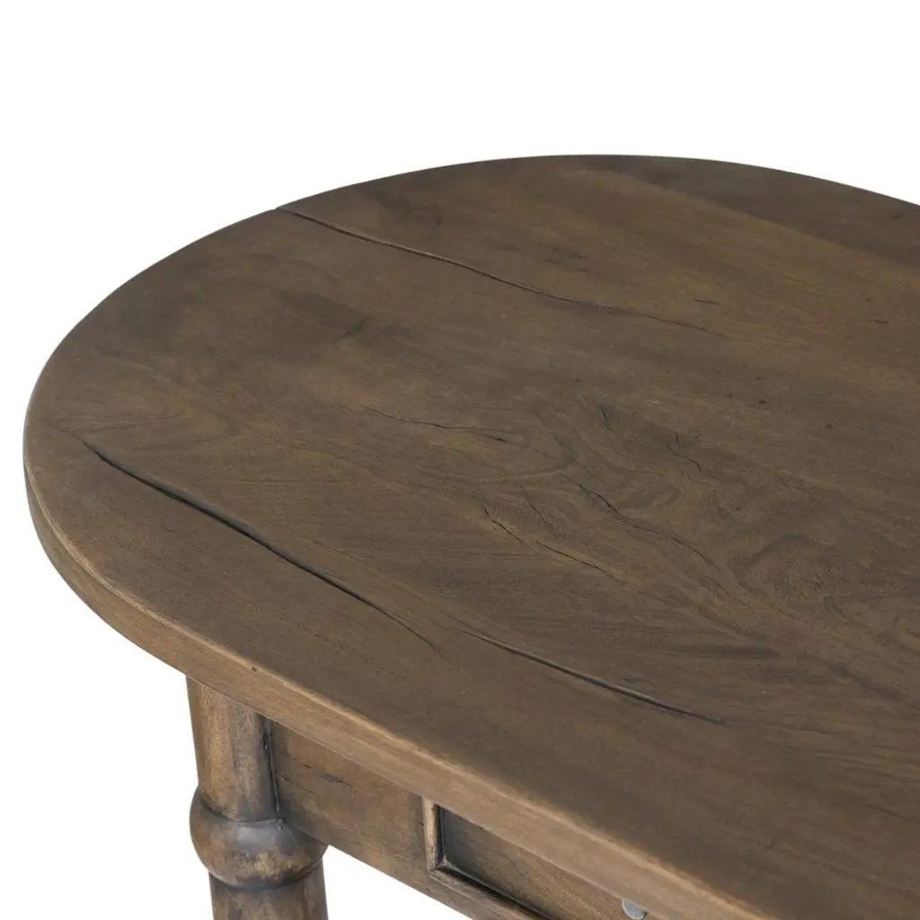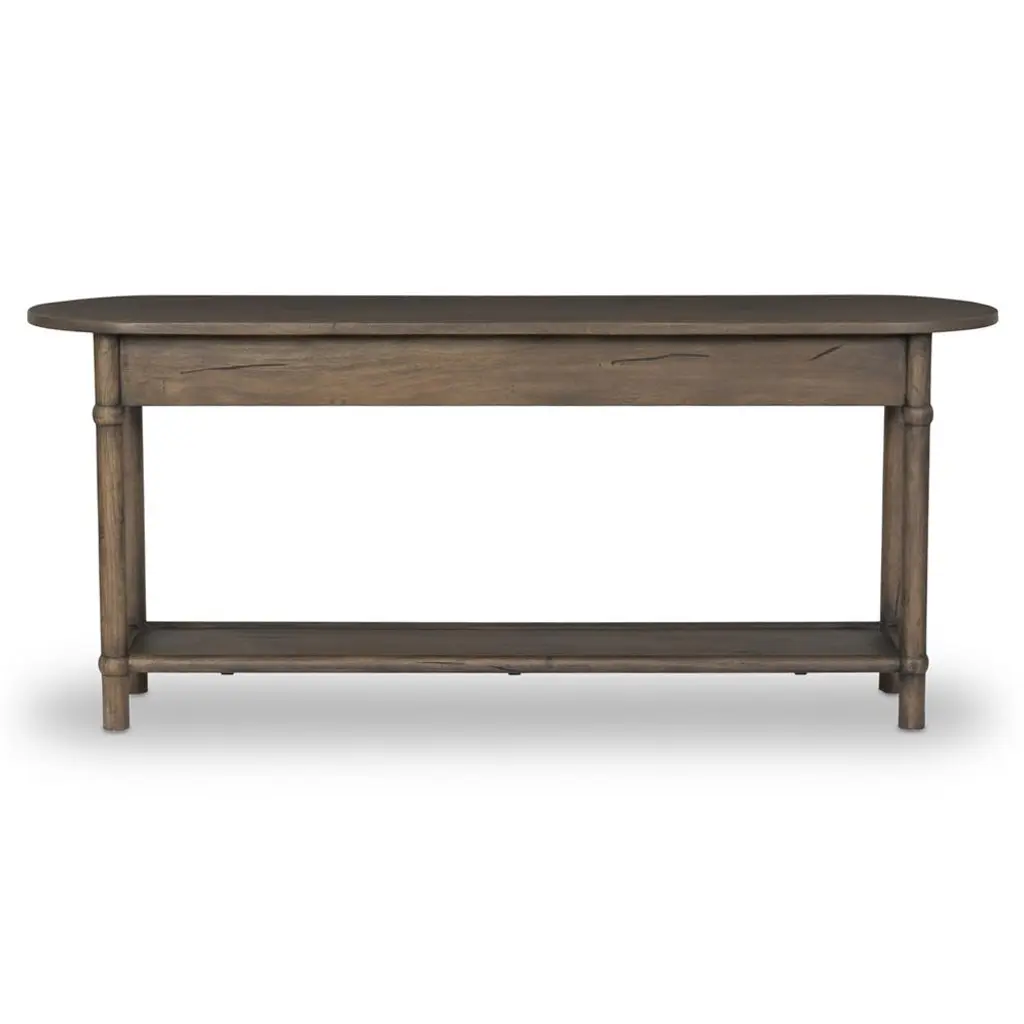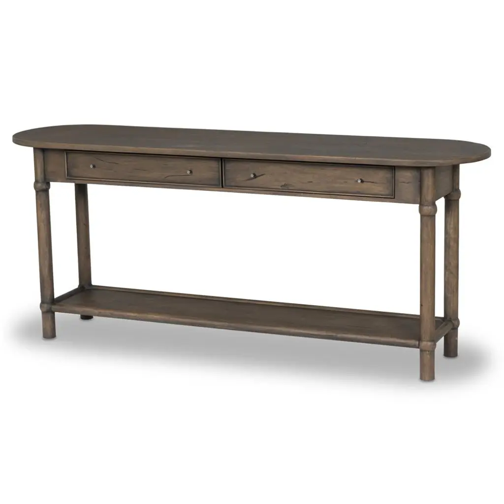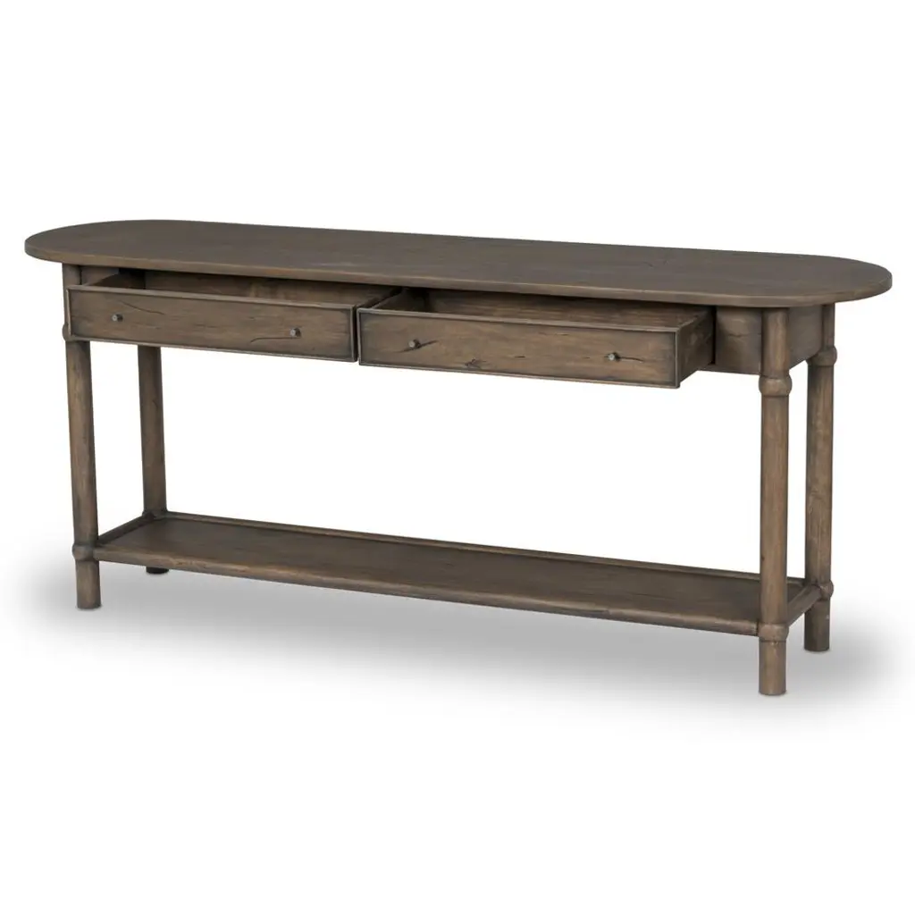 A design collaboration by Amber Lewis and Four Hands. Crafted from brown reclaimed wood with natural antiquing. The oval top features a rounded bullnose edge, and two drawers and bottom shelf provide ample storage. Simple frame and panel details on the drawers and round ball accents add character to this slender piece.