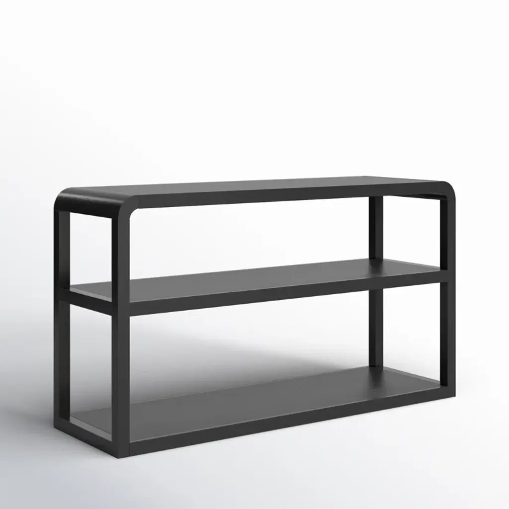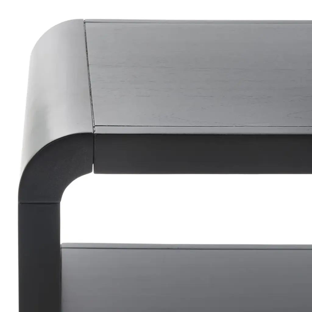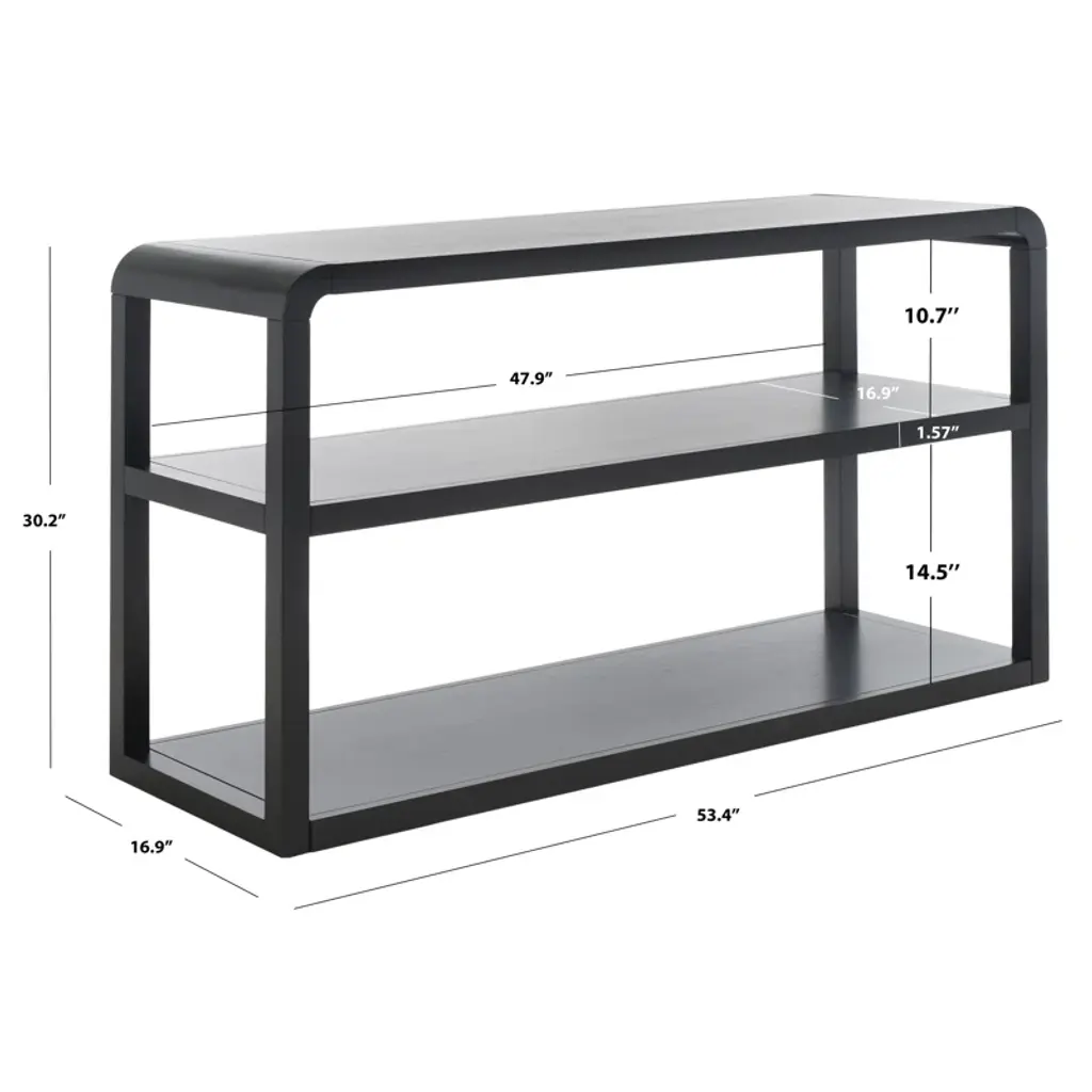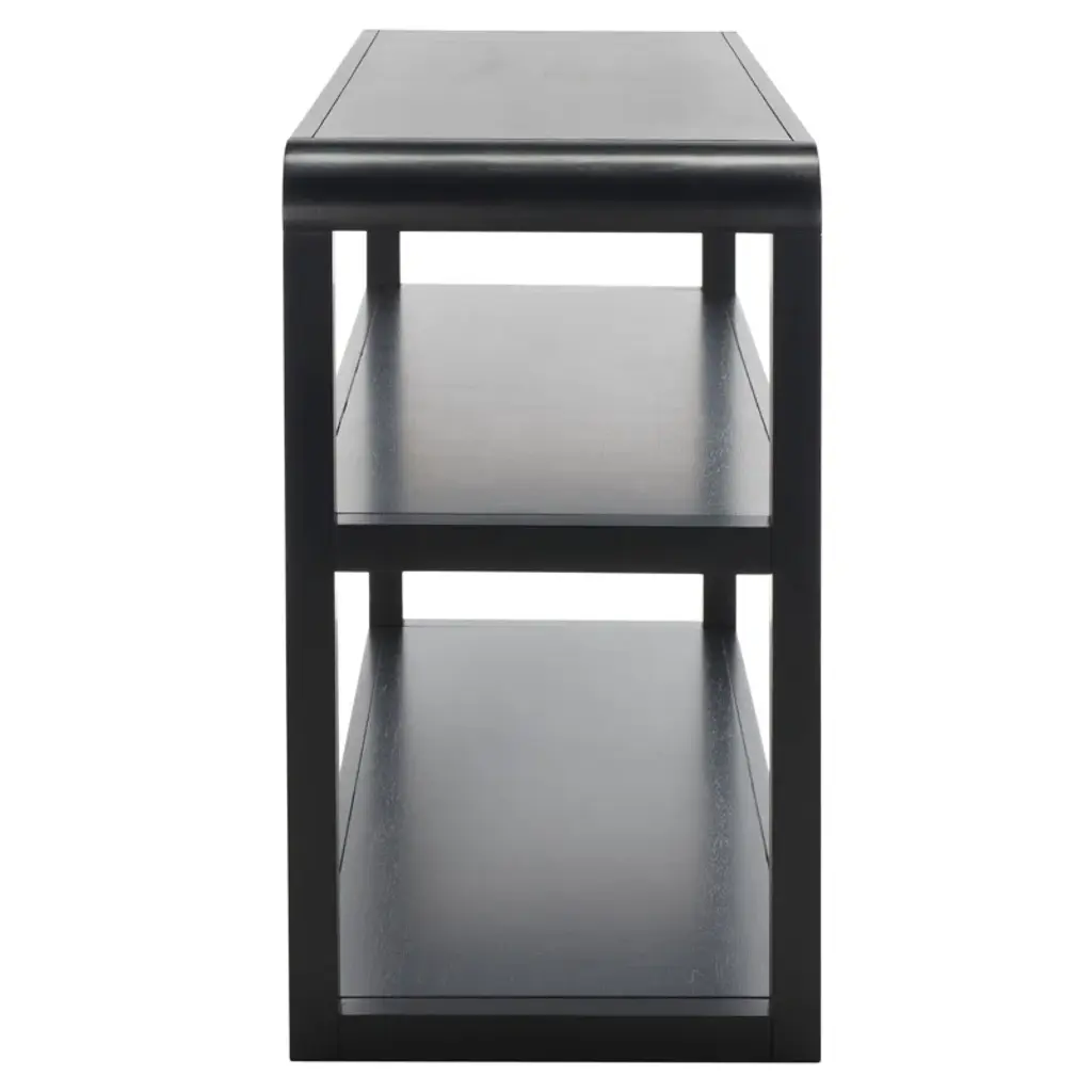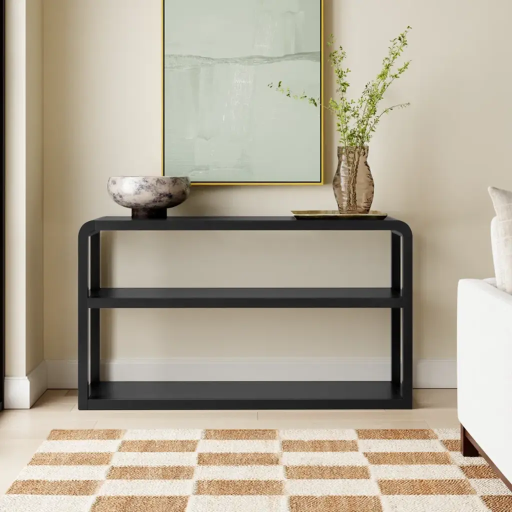 Uplift your home with the modern charm and elegance of our console table. The refined and streamlined design of the console table is accentuated by curved edges and slender legs. Crafted with solid and manufactured wood in a sleek walnut finish, our console table lends an elegant and effortless touch to any corner. It features two tiers and a tabletop to maximize space for both display and storage, as well as a versatile sofa or entryway table, or even a minibar or buffet.