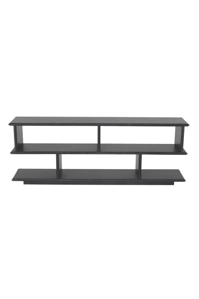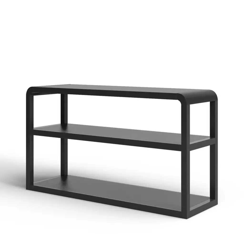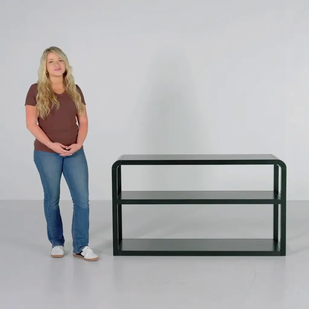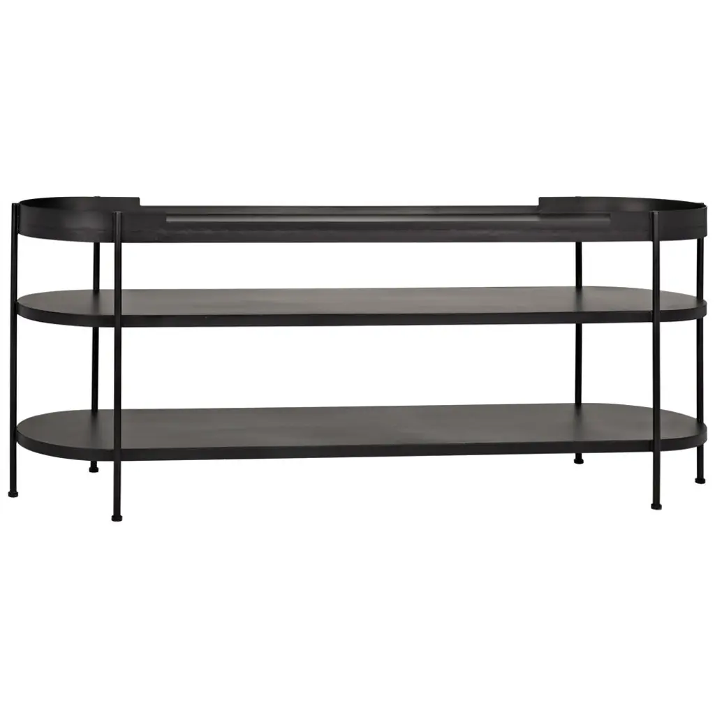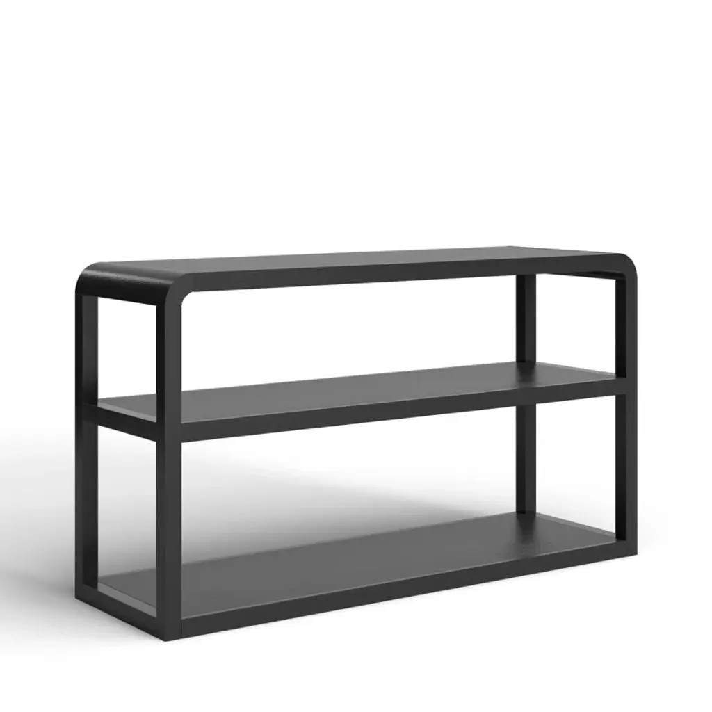 Uplift your home with the modern charm and elegance of our console table. The refined and streamlined design of the console table is accentuated by curved edges and slender legs. Crafted with solid and manufactured wood in a sleek walnut finish, our console table lends an elegant and effortless touch to any corner. It features two tiers and a tabletop to maximize space for both display and storage, as well as a versatile sofa or entryway table, or even a minibar or buffet.