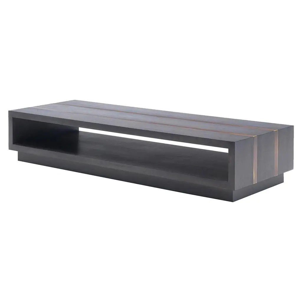 The distinct industrial inspiration imbuing this square coffee table make it a stunning addition to set a specific tone in contemporary decors. Crafted of gray-lacquered cherry, the clean frame consists of a hollow parallelepiped for easily storing magazines sitting atop a smaller one. Fine details in bronze run in parallel over its surface accenting it with a subtle light. A version without bronze details is also available.