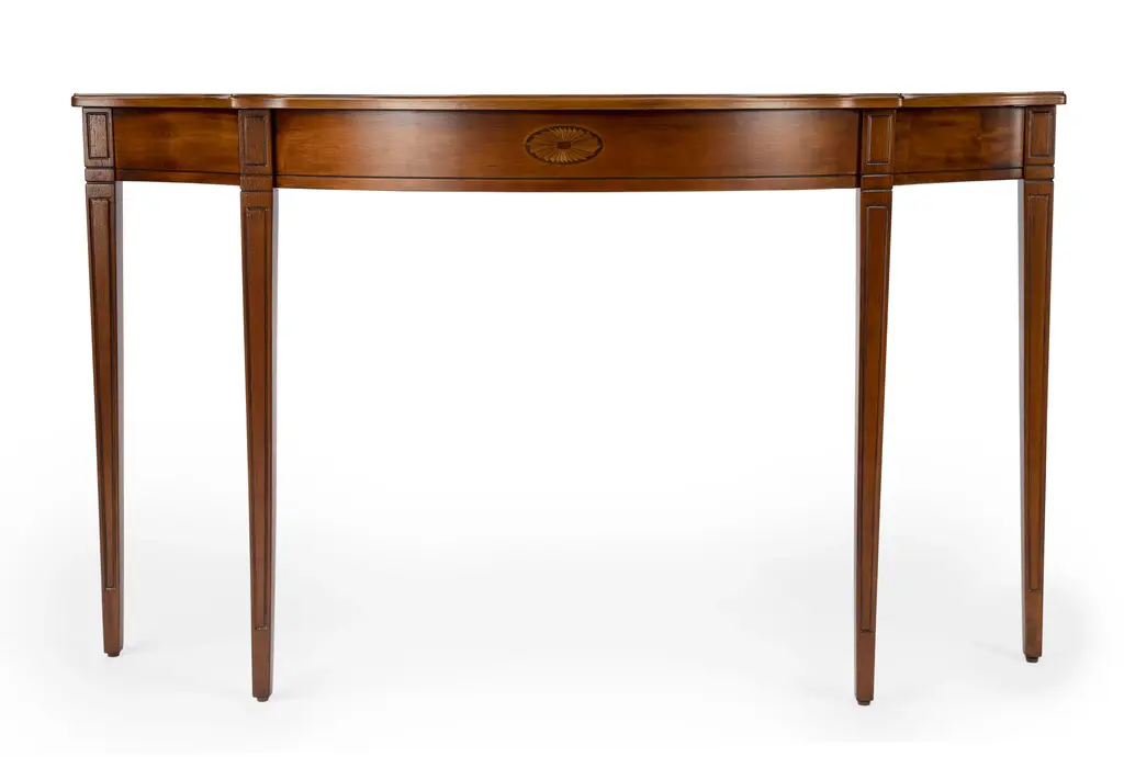 This Pembroke-inspired console is highly elegant, yet unpretentious. Ideal in a hallway, foyer or entryway, it is crafted from rubberWood solids and Wood products featuring beautiful curves with a cherry veneer top, linen-fold inlay patterns of maple and walnut veneers on both the top and apron front, all in a rich Olive Ash Burl finish. Durably Constructed With: Rubberwood Solids, MDF, Resin, Cherry, Maple and Walnut Veneers Product Construction Features: Finish Distressing Product Assembled Measurement & Weight: 32.25" H x 54.0" W x 15.0" D -- 22.0 lbs. 45 lbs. Suggested weight capacity Item Arrives: Needs Assembly Photo may slightly differ from actual item in terms of color/finish due to the lighting during photo shoot or the monitor's display.