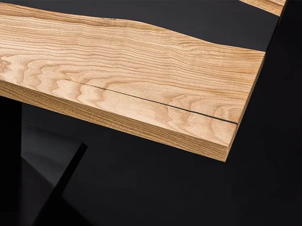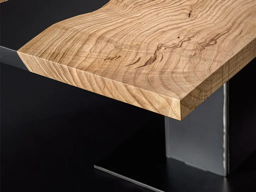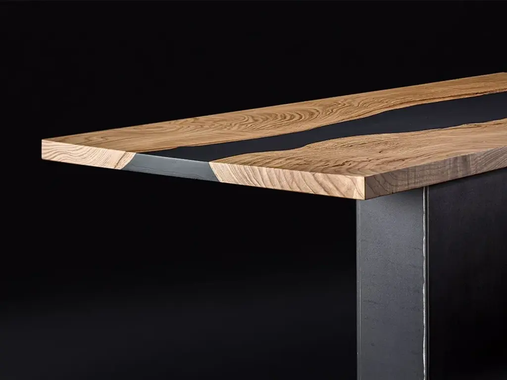 Organic and inorganic, natural and artificial, warm and cold, light and dark: contrasts are the essence of this table in chestnut and resin. Two panels of solid wood joined by a resin casting that runs like a black river between the light chestnut shores with their distinct grain. Skilful craftsmanship makes the surface and edges smooth, continuous and regular, seamlessly uniting wood and resin. This solid wood table is supported by a boxed iron base with visible welding that rises up like a column.Every Bruno Spreafico piece is unique and made to measure, with a wide choice of woods, bases, finishes, colours, materials, sizes and other features.