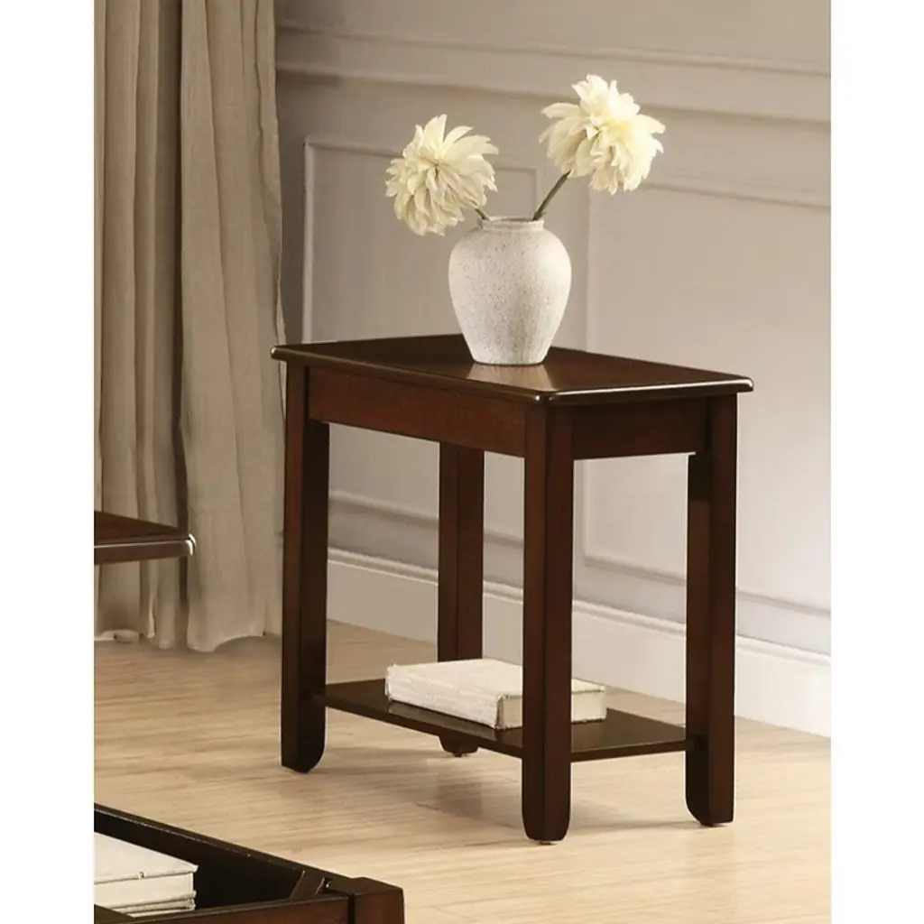 Dark cherry finishLower shelfContemporary StyleMade of birch veneer, wood and engineered wood Description & Dimensions Designed for placement in a number of living room settings, the Ballwin Collection is a functional and stylish addition to your home. The chairside table features an open display shelf. A deep cherry finish over sunburst veneers solidifies this versatile table. Lift-top cocktail table and end table are also available. PRODUCT DIMENSIONS: Overall Dimension: 14" x 23.75" x 24"H shelf interior: 18.75" x 8.75" x 15.5" (1) Listing Includes: One Chairside Table Only. End-Table and Cocktail Table: Not included Simple Assembly Require.