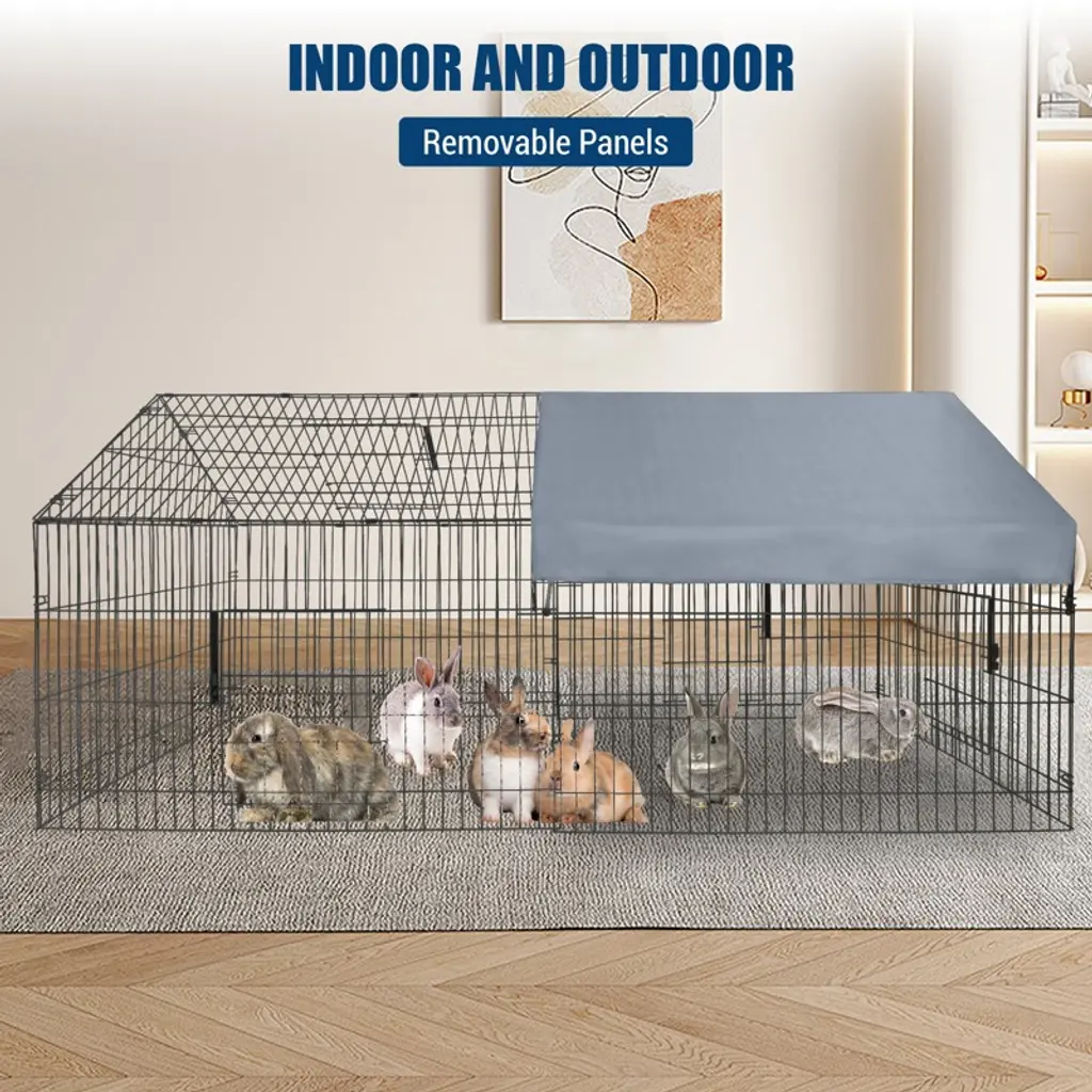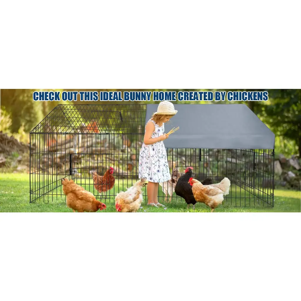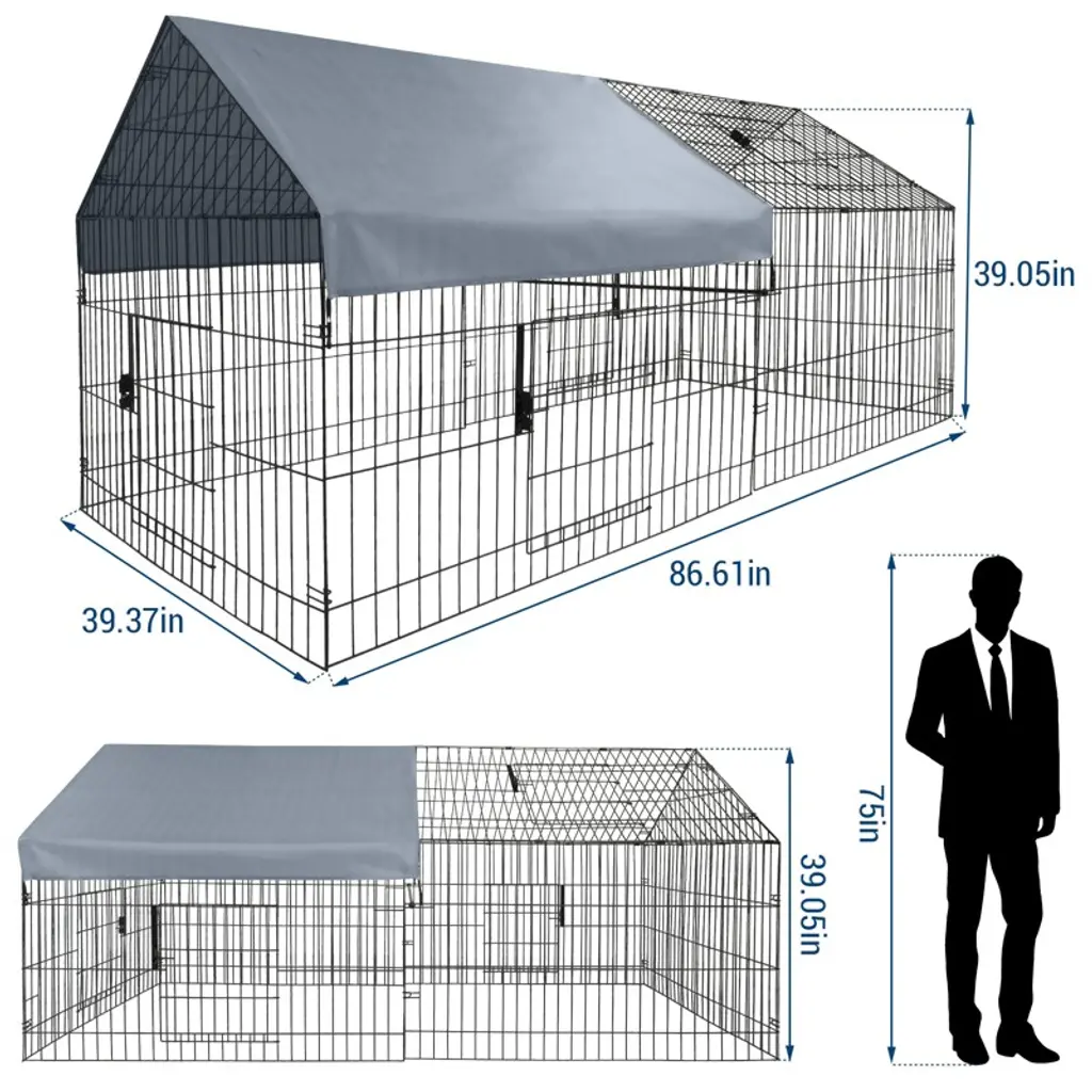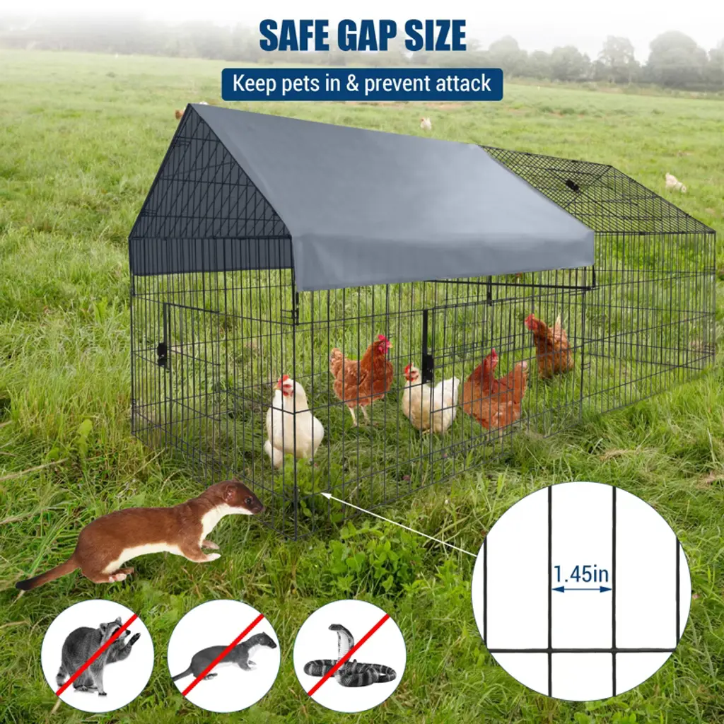 Protect and pamper your poultry with the spacious metal chicken coop featuring a waterproof cover, durable construction, and secure design—perfect for chickens, ducks, rabbits, and more! Why Choose This Chicken Enclosure? Weatherproof: Premium tarp for sun, rain, and snow protection. Durable: Rust-resistant metal frame for long-lasting use. Spacious: Ample room for small animals to move and play. Secure: Gravity door lock and safe gap size for pet safety. Easy to Use: Quick assembly and portable design. Extra Large Chicken Coop Highlights at a Glance: High-quality waterproof cover for all-weather protection. Durable metal construction ensures long-lasting use. Spacious design measuring 129.9 x 39.8 x 39.8 inches for ample exercise. Sturdy and secure with hooks, stable joints, and safe gap sizes. Easy assembly with included instruction manual for quick setup. Large Chicken Coop Key Features: Material: Sturdy metal frame with rust-resistant coating. Cover: Waterproof and UV-protected tarp. Size: 86"L x 40"W x 40"H – spacious for multiple animals. Doors: 1 top door + 3 side doors for easy access. Lock: Automatic gravity door lock for security. Portability: Removable panels and ground nail fixing. Perfect for: Backyard Poultry: Chickens, ducks, geese, and turkeys. Small Pets: Rabbits, guinea pigs, and other small animals. Indoor & Outdoor Use: Versatile for any setting. Specification: Extra Large Size: 129.9x39.8x39.8 inches Large Size: 86"L x 40"W x 40"H Material: Metal Color: Grey Packing List: 1xChicken Coop 1xInstruction Manual 2xRound Tubes 1xSunshade Fabric 16xSprings 6xDoor Latches Set 42xConnectors 4xWashers Note: Please follow the included assembly instructions carefully. Ensure that all parts are accounted for before beginning assembly to avoid any delays. Choose a dry, level area for the coop. Make sure it's protected from extreme weather conditions and provides shade during hot days for the comfort of your chickens. Garvee Metal Chicken Coop – Spacious, Secure, and Weatherproof Outdoor Enclosure