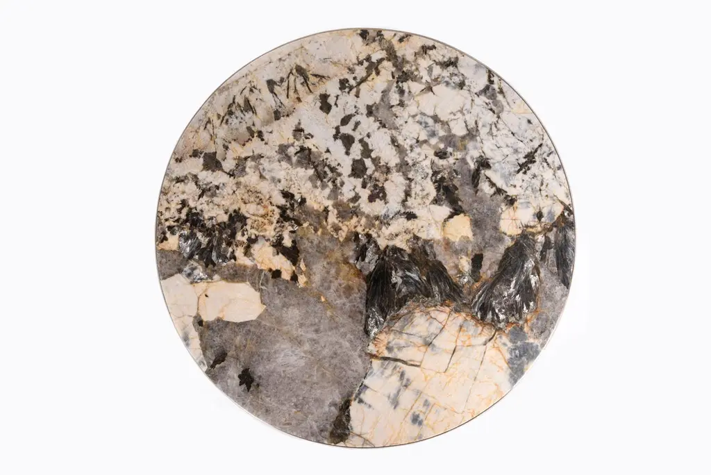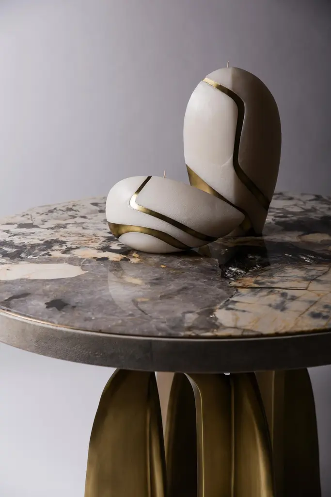 The Paris based label has distinguished themselves since their launch, with their iconic use of shagreen mixed with brass and other exotic materials. All furniture is handcrafted by skilled artisans, ultimately making each piece unique, designed in Paris and produced in the Philippines.The Chital breakfast table is a stunning piece, a statement in any space. The onyx stone inlaid top is stunning and one of a kind. The semi-precious stone has beautiful color tonalities and silver inserts. The side border of the top is inlaid in coal black shagreen and framed with a subtle metal inset, followed by bronze-patina brass sculptural legs clustered together as the base. This piece is designed by Kifu Augousti, the daughter of Ria and Yiouri Augousti. Sculptural candles not included, sold separately.The dimensions of this piece are 110 x 110 x 75 cm / 43.30" diameter x 29.5"All Kifu Paris pieces are handmade by artisans, ultimately making each piece unique. Custom color/sizing available on request. Wipe clean with soft dry cloth.Although inspired by her parents, her collection of Home Accessories and Furniture is a distinct identity of its own. Kifu uses handmade techniques of elaborate inlay patterns of shagreen, shells, semi-precious stones, materials she experienced as a child growing up in her parent’s studio, but interpreted in a younger quirkier way reflecting her youth. From her "jewelry inspired knobs" on decorative boxes, gold bar boxes and an extravagant inlay pattern mix of shagreen and shell inspired by galactic constellations, as seen on her enormous round mirror, is refreshing to see. Kifu embodies whimsical elements throughout her collection and is not afraid to be daring and unexpected in her approach to design. All shagreen-covered items should be kept out of direct sunlight, color variants may occur on the stingray and other exotic finishes, but this showcases the Parisian label's commitment to creating authentic luxurious products using natural components.