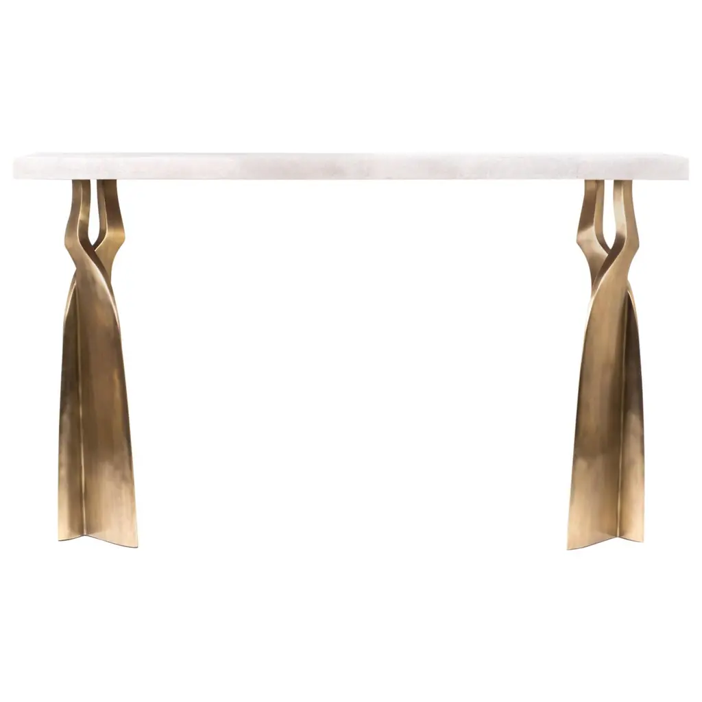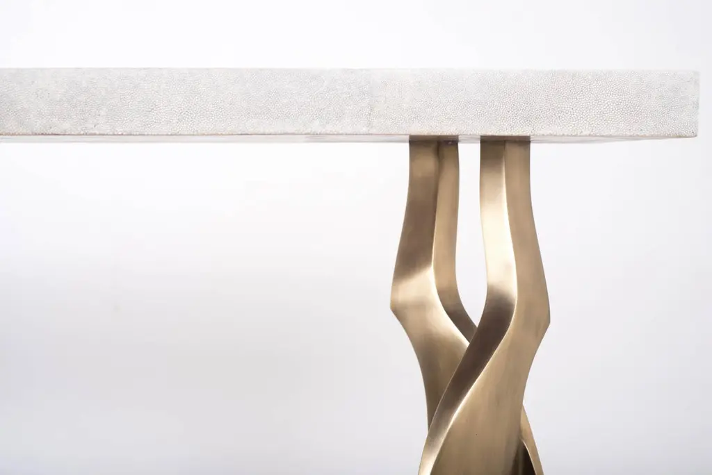 The Paris based label has distinguished themselves since their launch, with their iconic use of shagreen mixed with brass and other exotic materials. All furniture is handcrafted by skilled artisans, ultimately making each piece unique, designed in Paris and produced in the Philippines.The Chital console table is both dramatic and organic it’s unique design. The purple shagreen inlaid top sits on a pair of ethereal & sculptural bronze-patina brass legs. This piece is designed by Kifu Augousti the daughter of Ria and Yiouri Augousti. Available in other finishes see images at end of slide.The dimensions of this piece are 150 x 35 x 90 cm / 59" x 13.77" x 35.5"All Kifu Paris pieces are handmade by artisans, ultimately making each piece unique. Custom color/sizing available on request. Wipe clean with soft dry cloth.Although inspired by her parents, her collection of Home Accessories and Furniture is a distinct identity of its own. Kifu uses handmade techniques of elaborate inlay patterns of shagreen, shells, semi-precious stones, materials she experienced as a child growing up in her parent’s studio, but interpreted in a younger quirkier way reflecting her youth. From her "jewelry inspired knobs" on decorative boxes, gold bar boxes and an extravagant inlay pattern mix of shagreen and shell inspired by galactic constellations, as seen on her enormous round mirror, is refreshing to see. Kifu embodies whimsical elements throughout her collection and is not afraid to be daring and unexpected in her approach to design. All shagreen-covered items should be kept out of direct sunlight, color variants may occur on the stingray and other exotic finishes, but this showcases the Parisian label's commitment to creating authentic luxurious products using natural components.