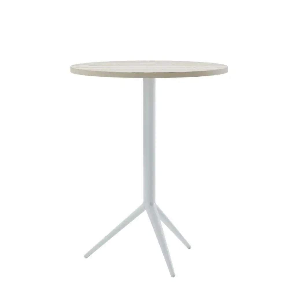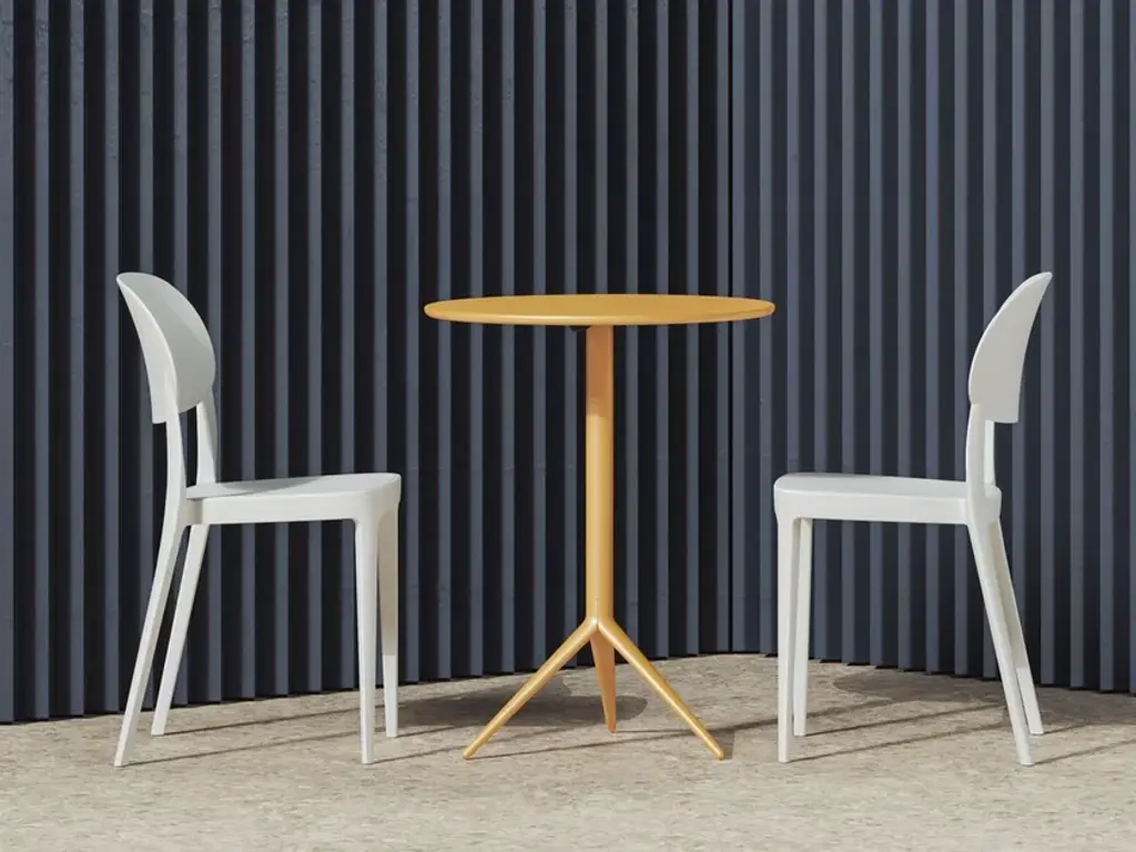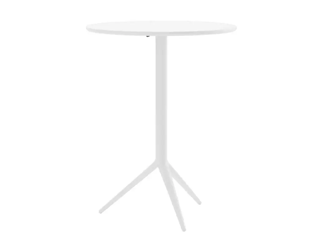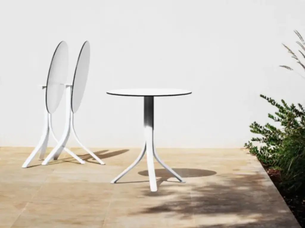 Table for contract and residential spaces, indoor or outdoor. Versions: - fixed round top, 600 mm metal sheet- fixed round top, 690 mm HPL- fixed round top, 600 mm Melamine- tip-up round top, 600 mm metal sheet- tip-up round top, 590 mm HPLColors: Foot painted aluminium: white, sand, anthracite. Tops: Metal sheet white, sand, anthracite. HPL white, black, red. Melamine from sample book.Ciak is a folding table with three aluminum legs, lightweight and fancy. Available in many bright and intense colors, Ciak is extremely versatile and can be used in any contract space, for a look in line with the latest trends. The top is manufactured in painted metal or hpl with a clever mechanism under the top, that allows a 90° tipping, recognizable by its magenta color, institutional color that distinguishes Alma Design. A great help for warehousing and reduced clutter. The high-quality finishes, the UV and weather resistance surfaces make it ideal to furnish both indoor and outdoor spaces. Ciak can be supplied with round or square top, tip-up or also fixed.
