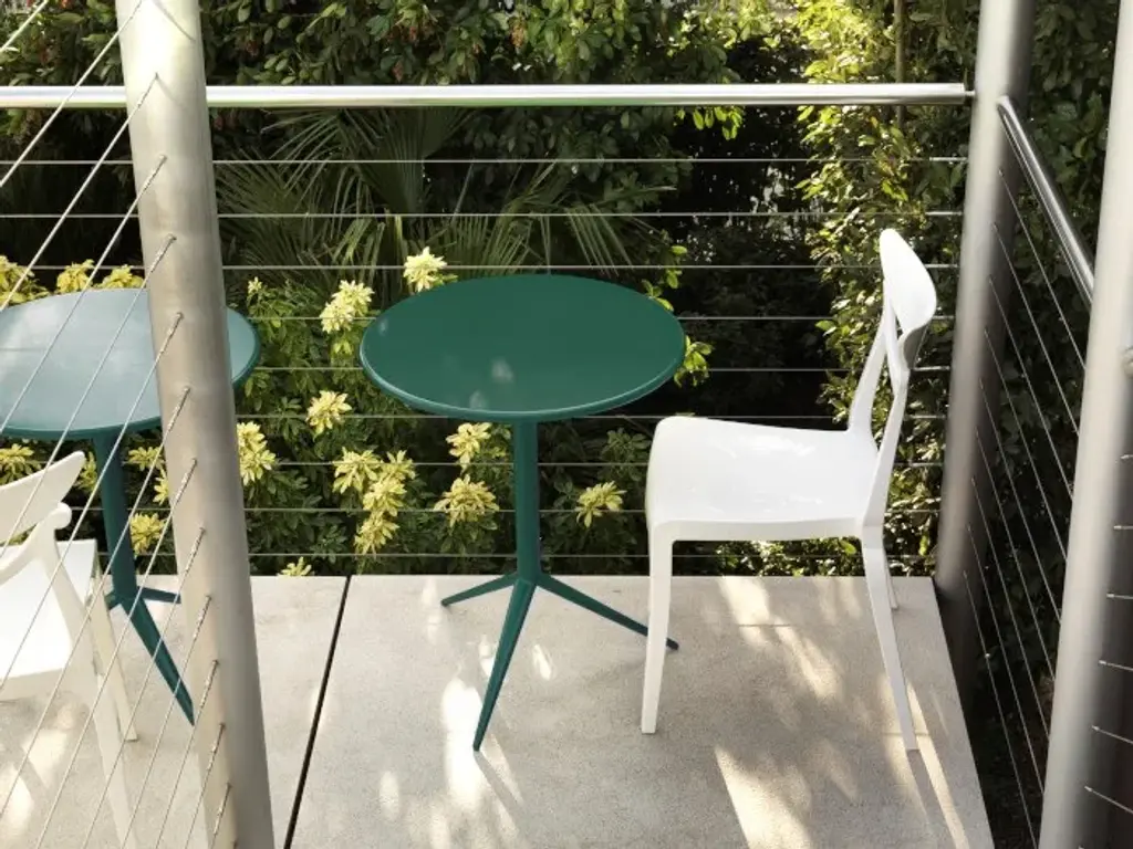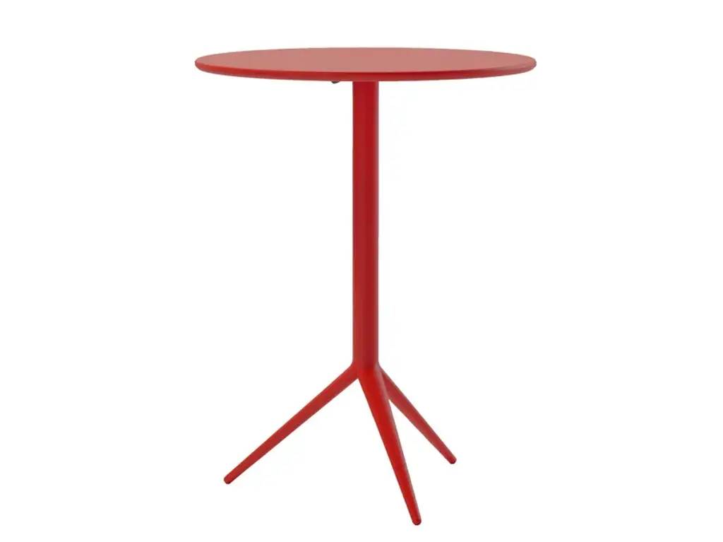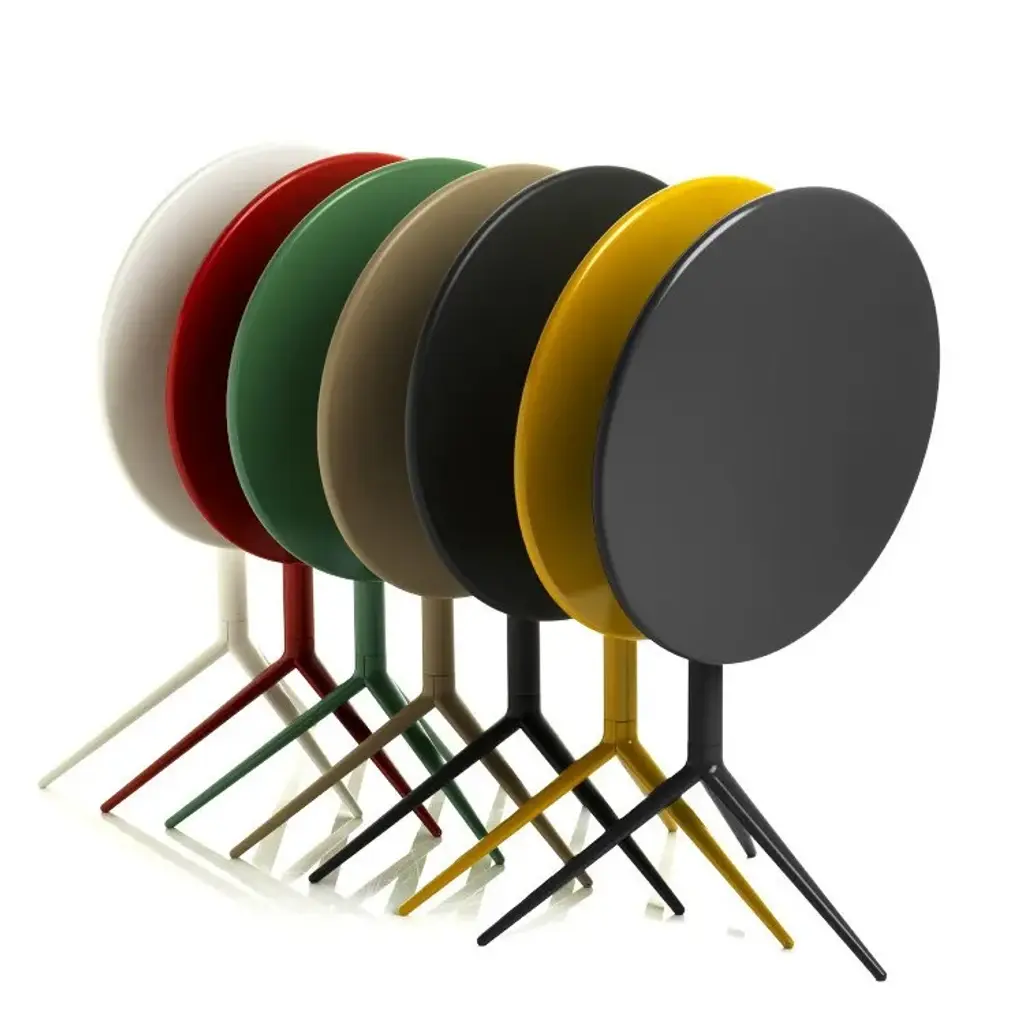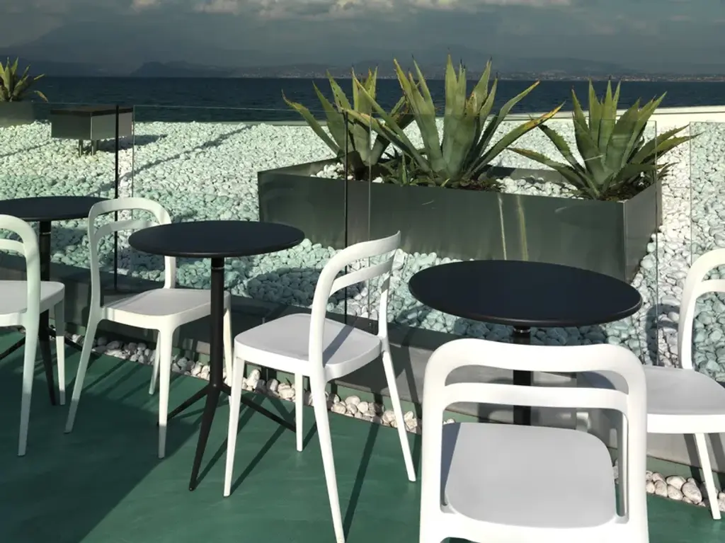 Table for contract and residential spaces, indoor or outdoor. Versions: - fixed round top, 600 mm metal sheet- fixed round top, 690 mm HPL- fixed round top, 600 mm Melamine- tip-up round top, 600 mm metal sheet- tip-up round top, 590 mm HPLColors: Foot painted aluminium: white, sand, anthracite. Tops: Metal sheet white, sand, anthracite. HPL white, black, red. Melamine from sample book.Ciak is a folding table with three aluminum legs, lightweight and fancy. Available in many bright and intense colors, Ciak is extremely versatile and can be used in any contract space, for a look in line with the latest trends. The top is manufactured in painted metal or hpl with a clever mechanism under the top, that allows a 90° tipping, recognizable by its magenta color, institutional color that distinguishes Alma Design. A great help for warehousing and reduced clutter. The high-quality finishes, the UV and weather resistance surfaces make it ideal to furnish both indoor and outdoor spaces. Ciak can be supplied with round or square top, tip-up or also fixed.