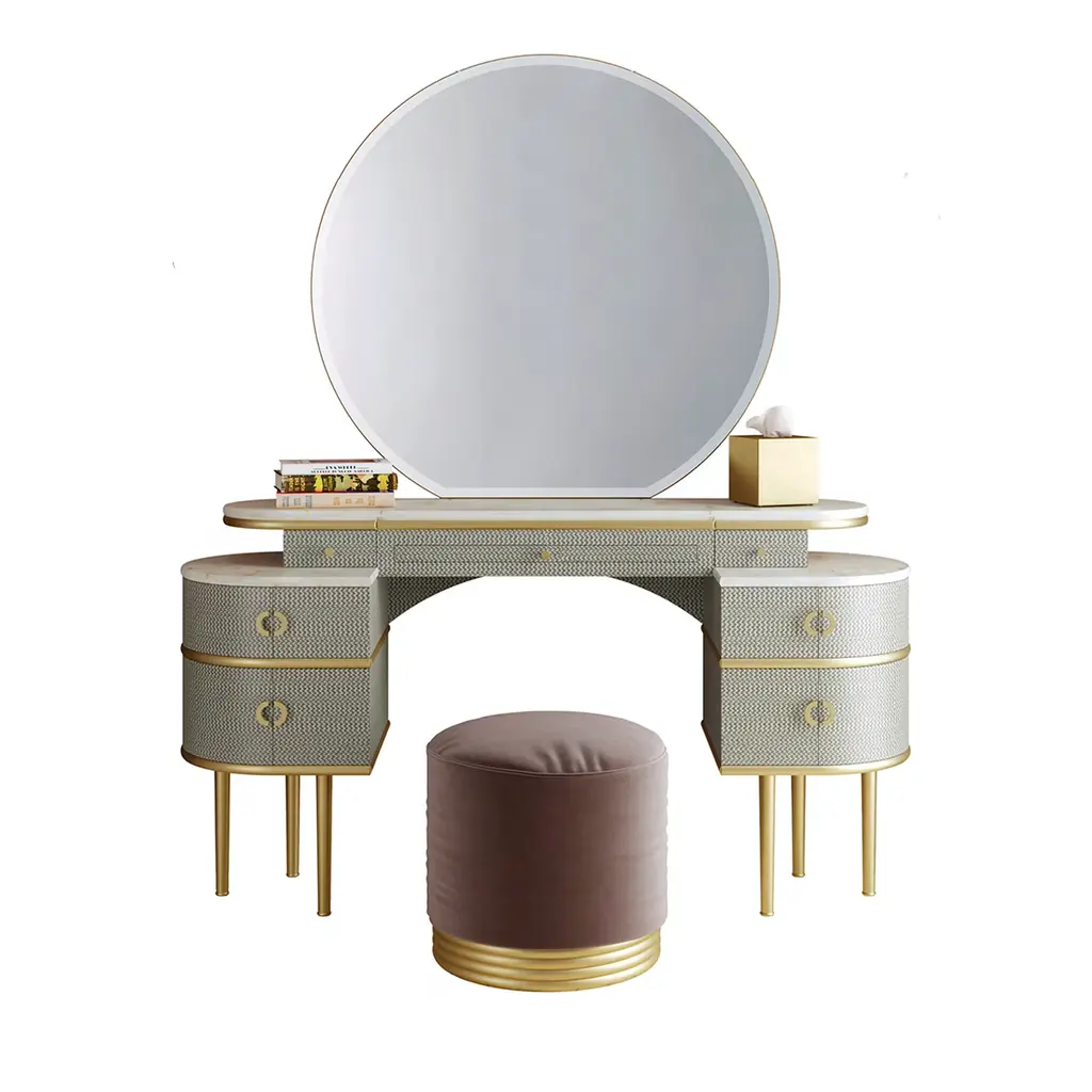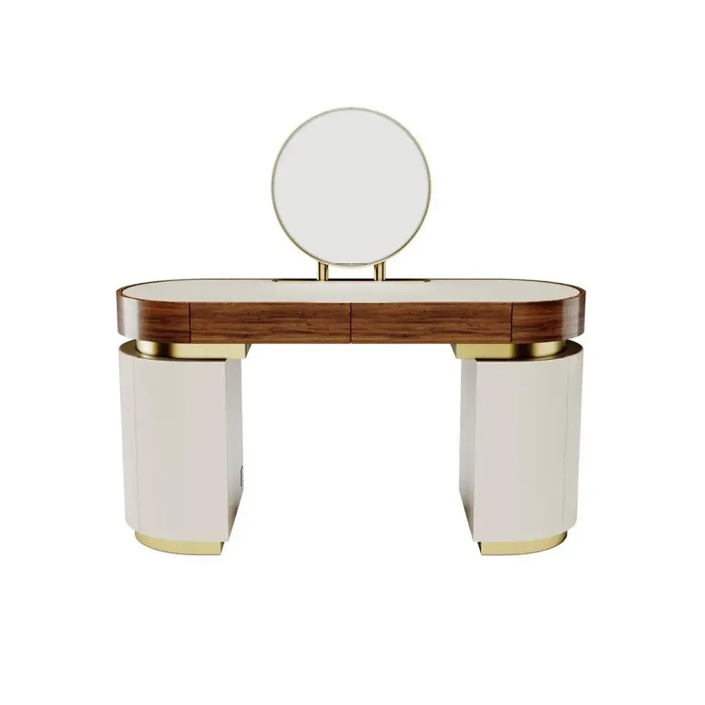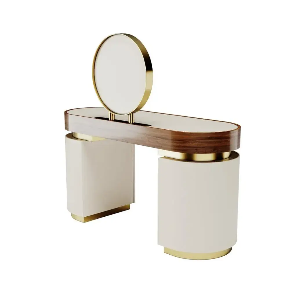 Claire Dressing Table embraced an Art Deco style with curvy and opulent shapes. This eye-catching modern dressing table has the promise of enriching any master bedroom design project\. MATERIALS: Structure Walnut Veneer and Gloss Beige Lacquer and Polished Brass; Clear Mirror with Gold Polished Stainless Steel Trim; Table Top in Upholstered Synthetic Leather.