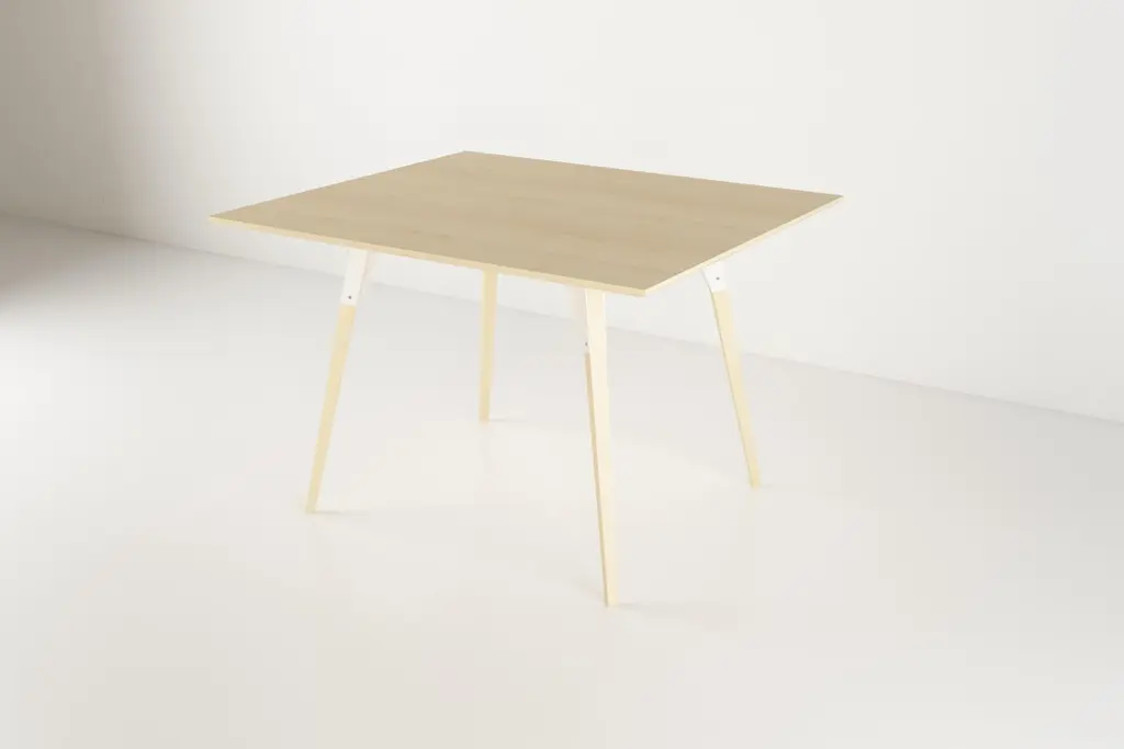 The Clarke Collection comes in ten different tabletop sizes, two wood species, and two metal finishes. The exposed stainless steel bolts blur the line between Scandinavian and Industrial styles.