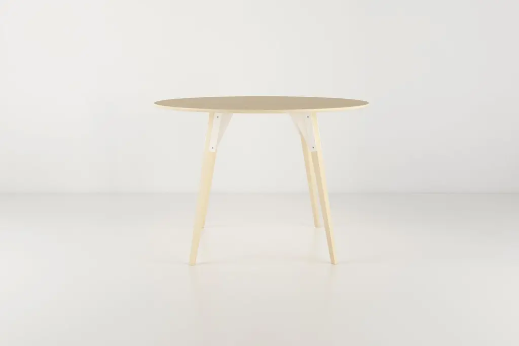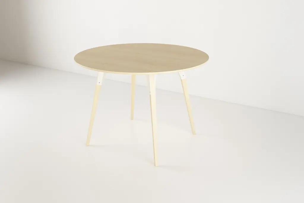 The Clarke Collection comes in ten different table top sizes, two wood species, and two metal finishes. The exposed stainless steel bolts blur the line between Scandinavian and Industrial styles.
