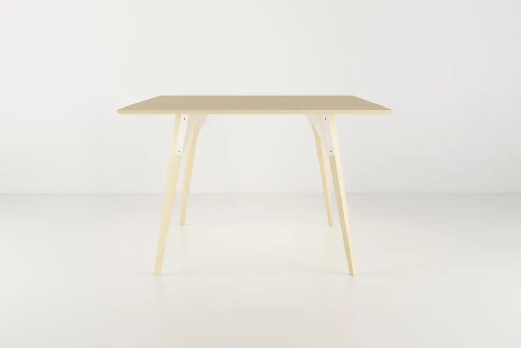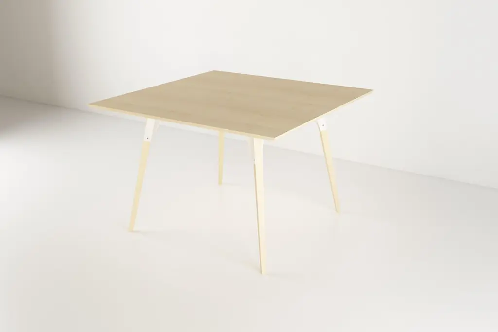 The Clarke Collection comes in ten different table top sizes, two wood species, and two metal finishes. The exposed stainless steel bolts blur the line between Scandinavian and Industrial styles.