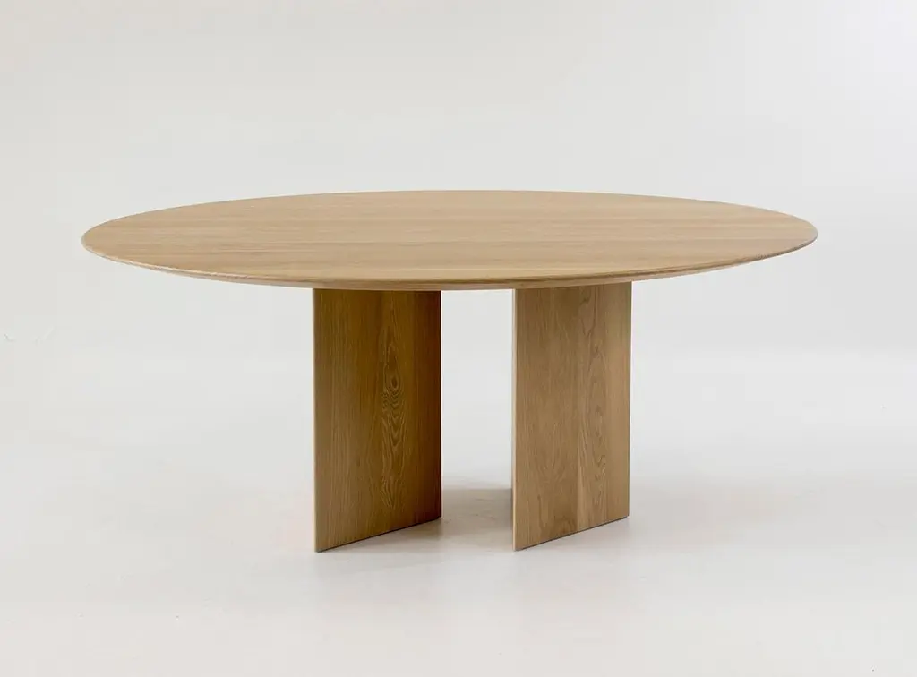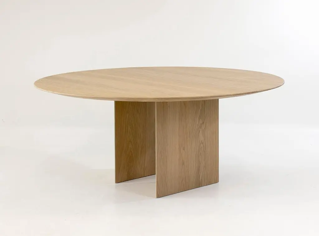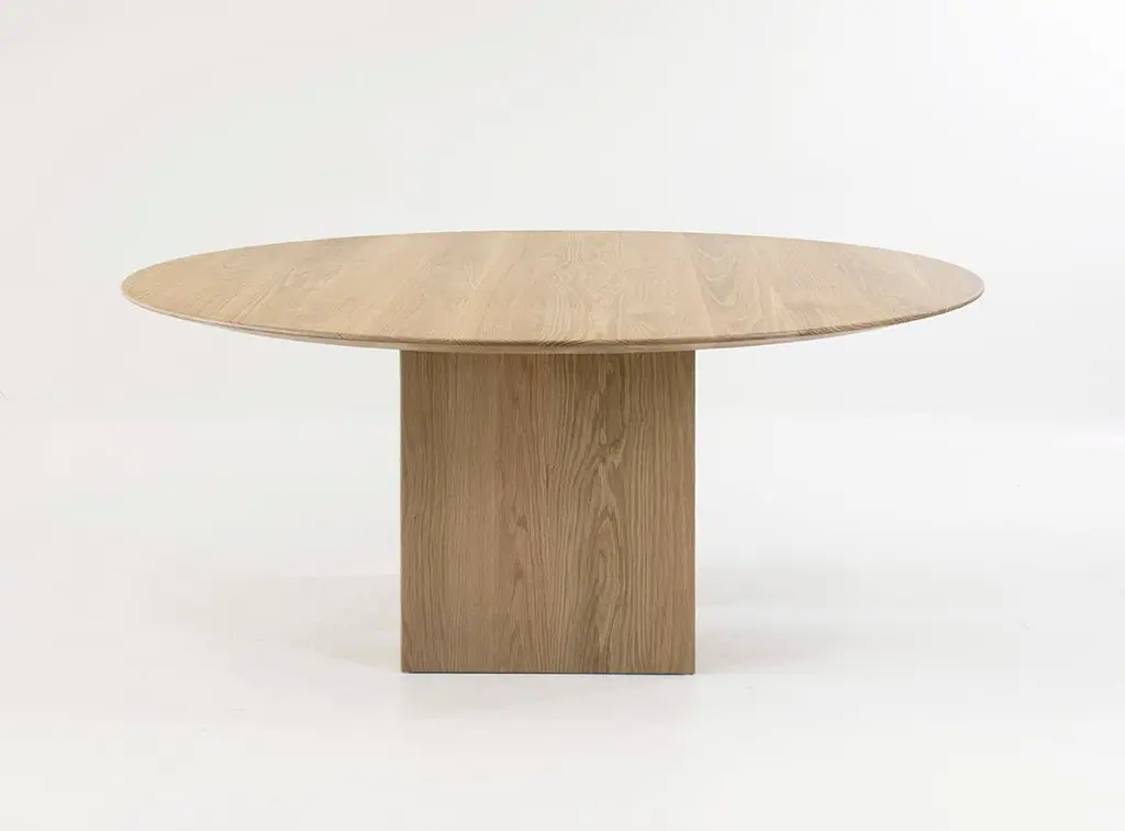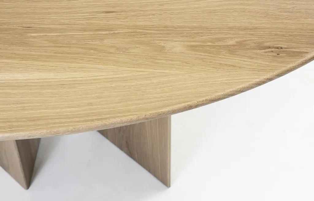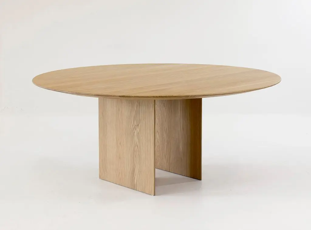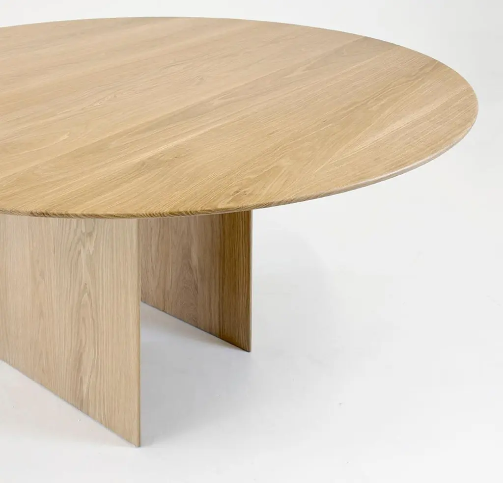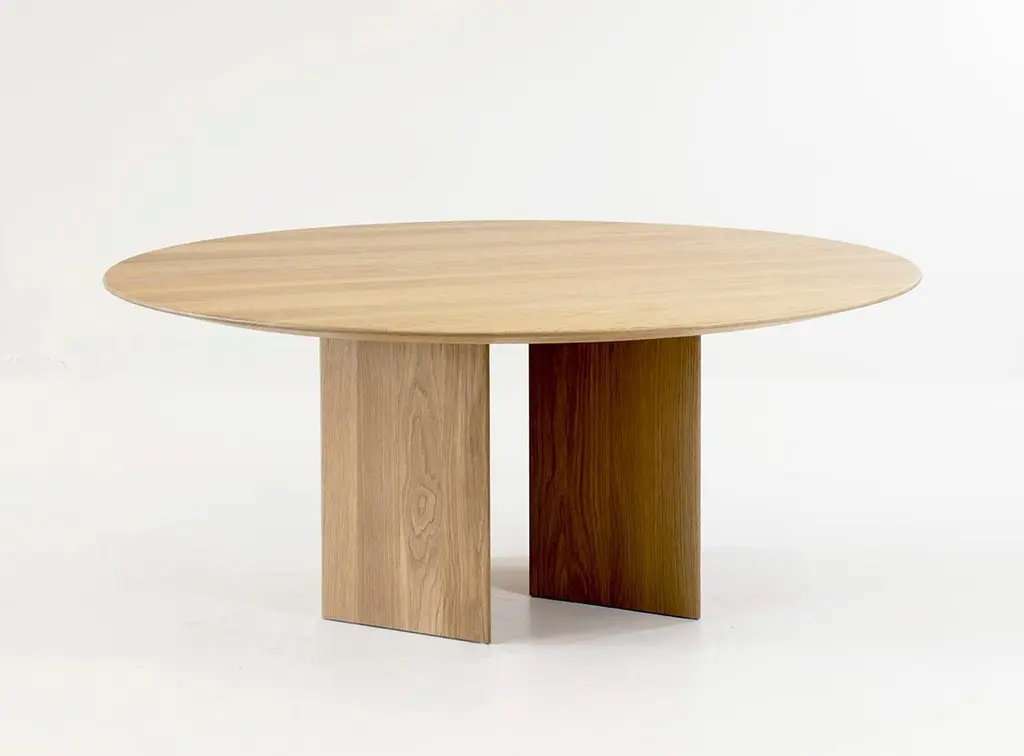 The round version of this table explores similar ideas as its rectangular sibling where the offset base allows for a variety of differing visuals depending on the line of sight. Available in both wood and marble this table can be customized to fit any space.