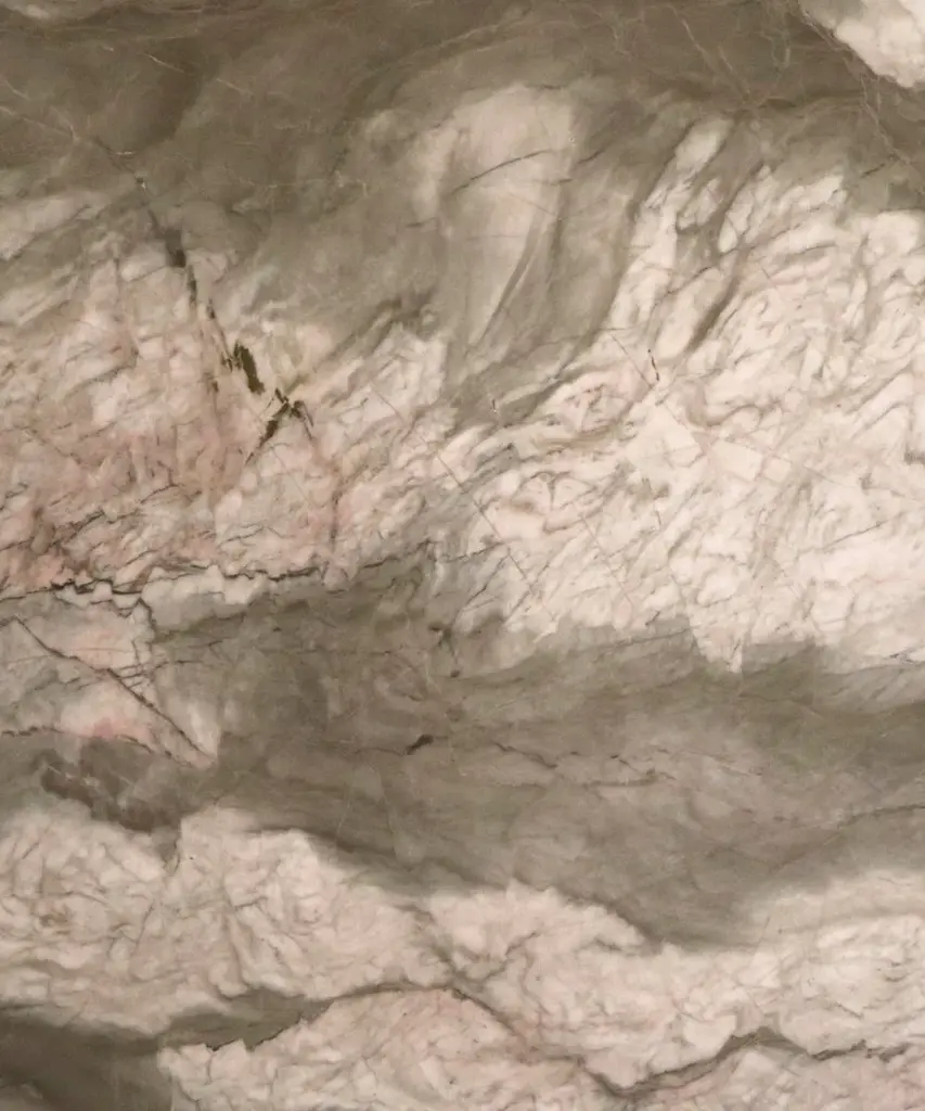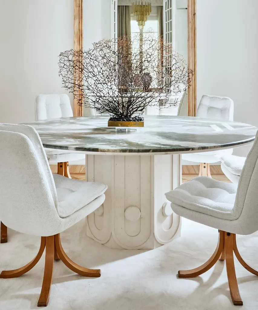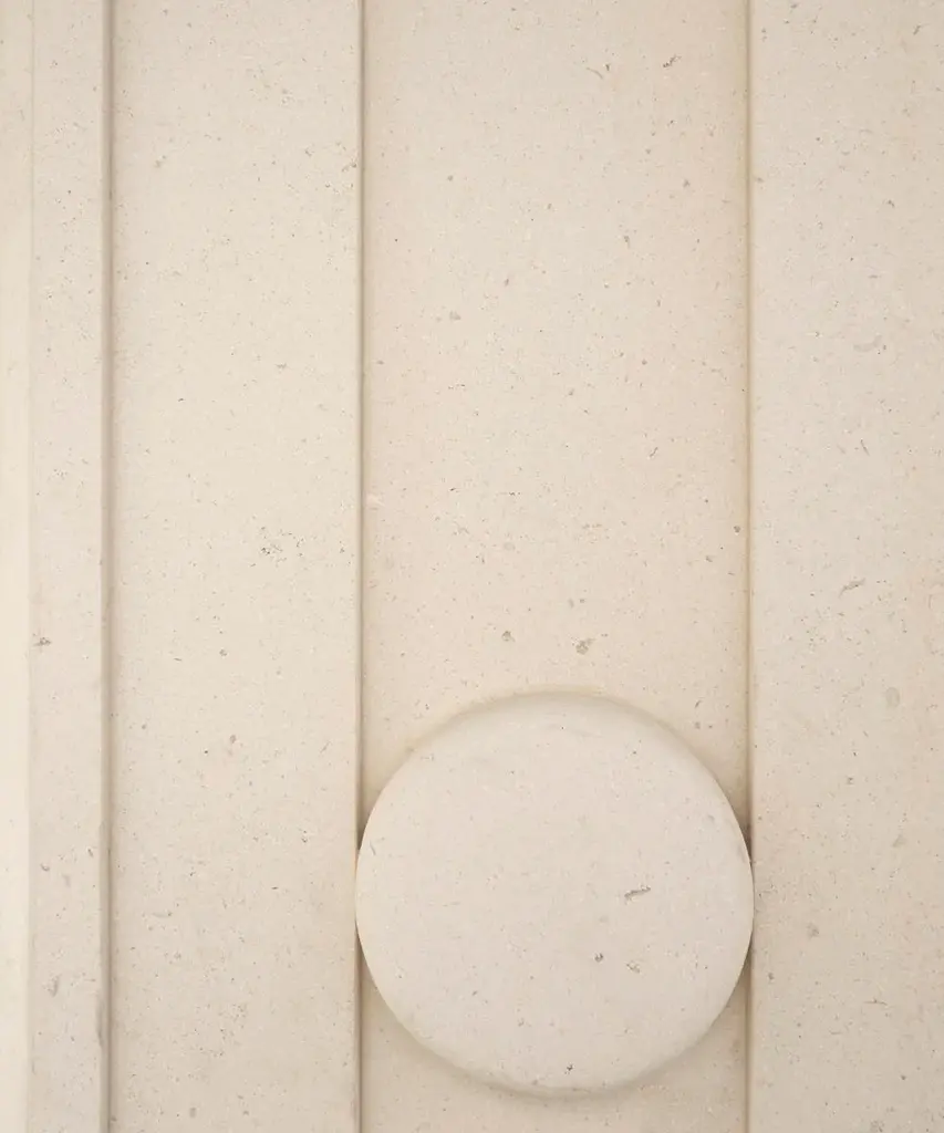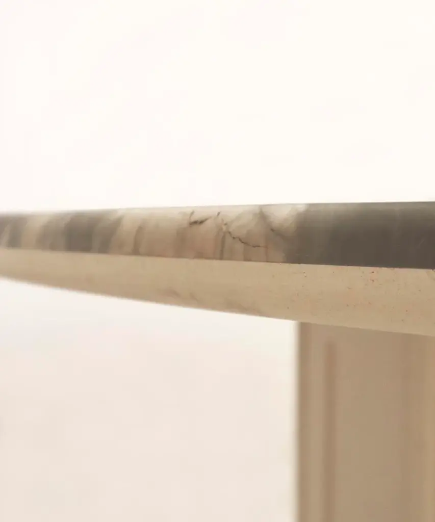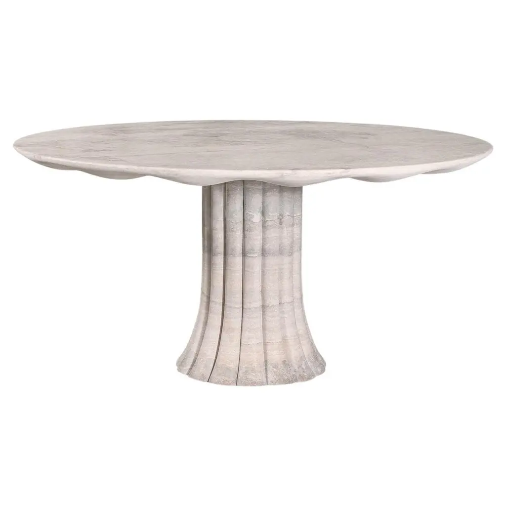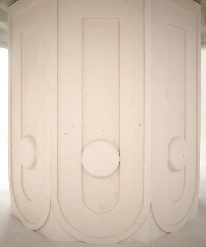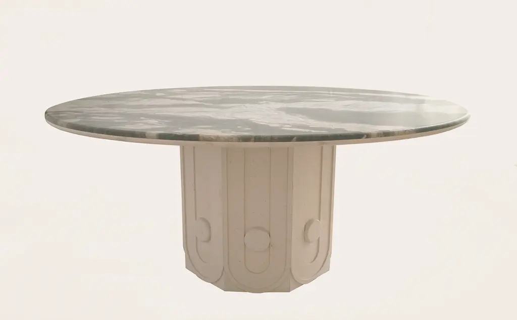 Table with oval quartzite top with rounded edge and octagonal base carved with geometric motifs in limestone.