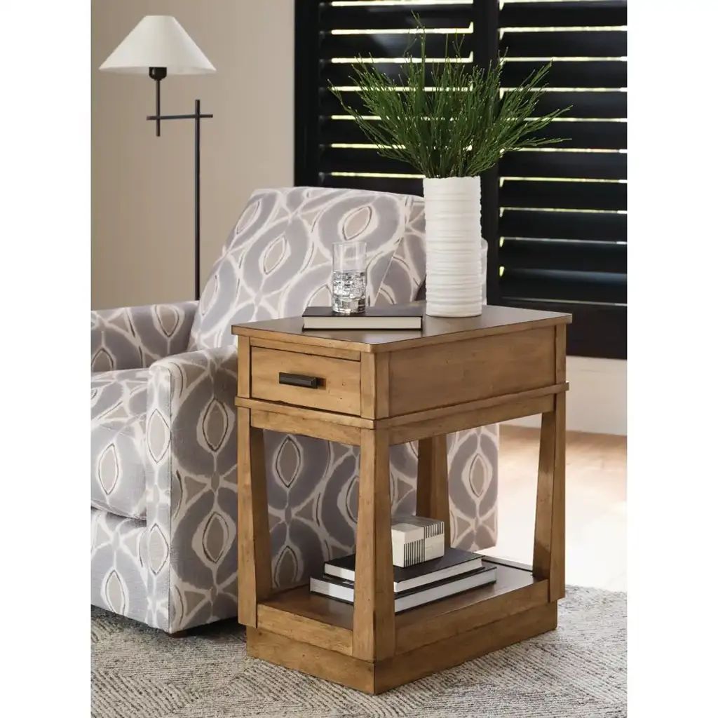 Drawing inspiration from early 20th century American architecture, the Clifton Collection's Charging Chairside Table reimagines a classic silhouette for modern living. Crafted from rich Alder veneers and select wood solids, this sophisticated piece seamlessly blends traditional design with contemporary convenience. Its thoughtful features include a practical lower shelf for display, a smooth-gliding drawer for storage, and built-in electrical outlets to power today's devices. Adjustable levelers ensure perfect positioning on any surface. Each detail, from its architectural influences to its functional elements, transforms this table into more than just furniture – it's a bridge between timeless style and modern necessity.