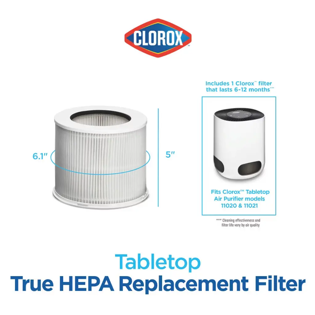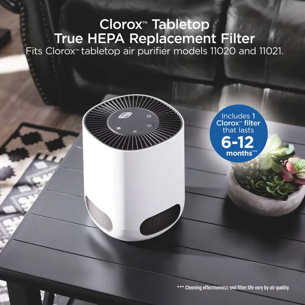 Clorox® is a trusted brand for powerful cleaning and has helped families for over 100 years. The Clorox™ Tabletop True HEPA Replacement Filter builds on our trusted legacy by helping you protect your family from allergens, pet dander, dust, smoke, viruses, bacteria and more. It captures 99.97% of allergens and particulates* and reduces viruses and bacteria** so you can breathe easier. The 2 stage 360° filter delivers 360° air purification by capturing particulates in 2 filters: a pre-filter and a True HEPA filter. Fits Clorox™ Tabletop Air Purifier model # 11020 and Clorox™ Tabletop Smart Air Purifier model # 11021. Includes 1 Clorox™ filter that lasts 6-12 months.***
