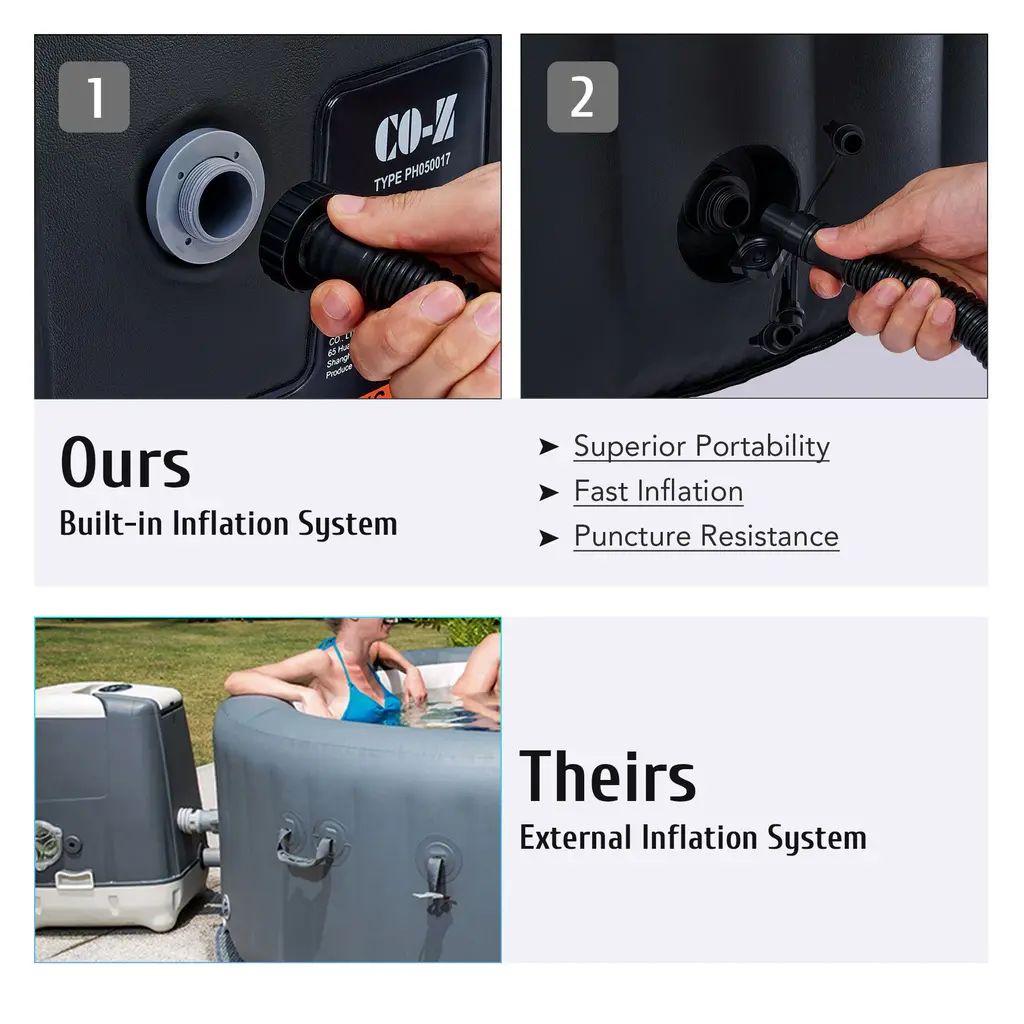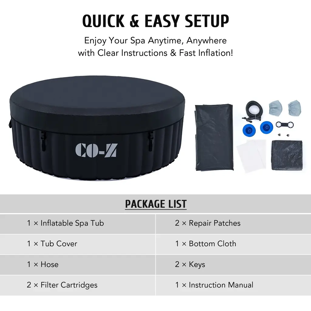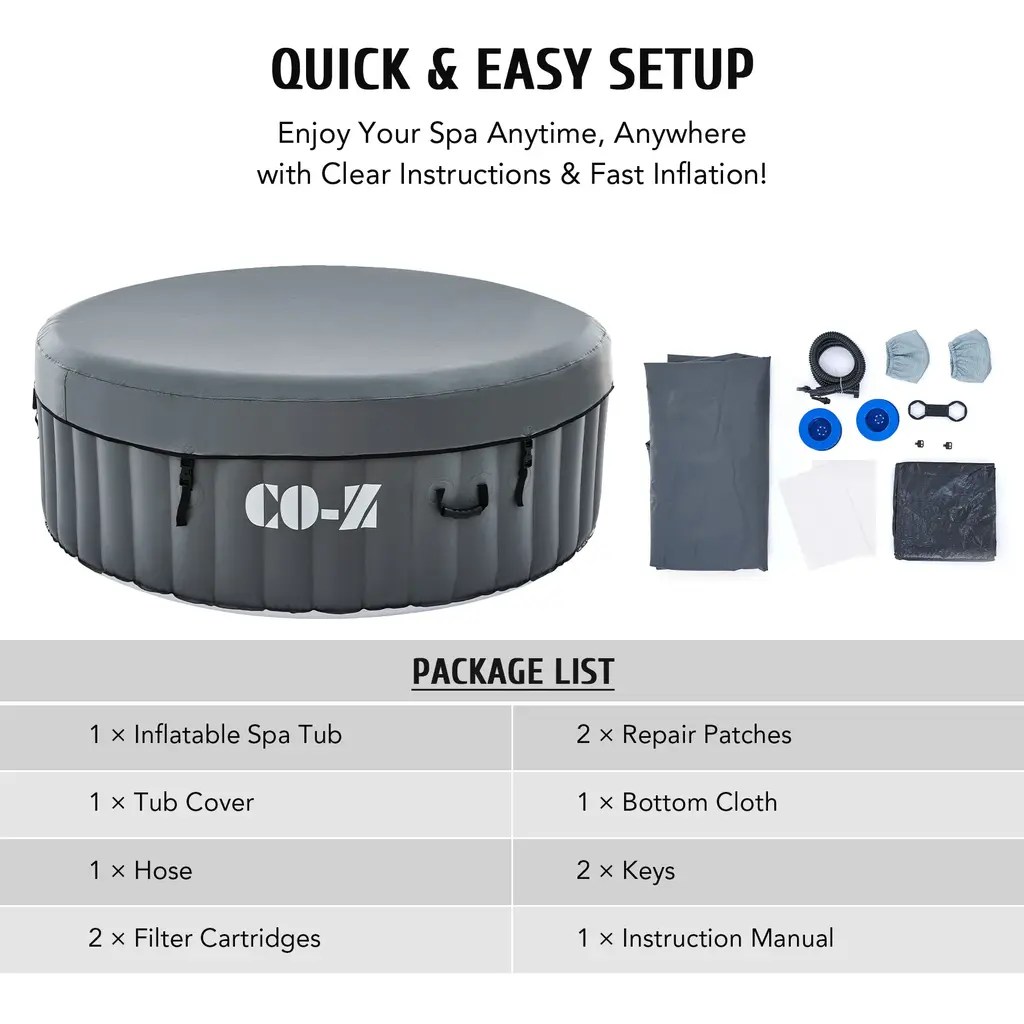 Experience the ultimate relaxation with CO-Z Round Inflatable Hot Tub, the perfect addition to your backyard oasis. With its durable PVC build, intuitive control panel, and rejuvenating bubble jets, this 6-foot-wide hot tub accommodates up to four adults, offering you and your loved ones a true-to-spa experience in the comfort of your own home. Its fitted cover and two filter cartridges make maintenance a breeze, while the built-in drain ensures quick and easy water removal. Create memories and unwind with CO-Z's portable hot tub.Features: