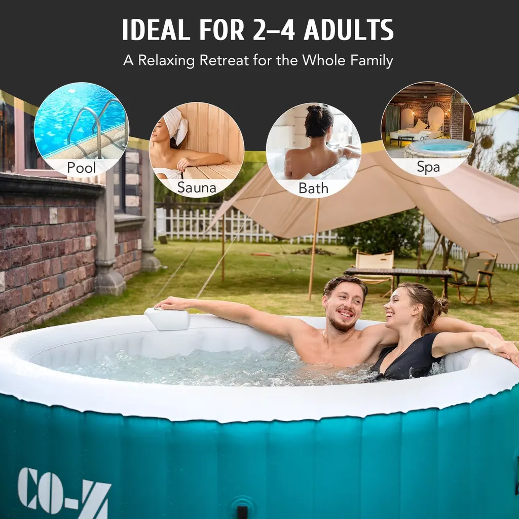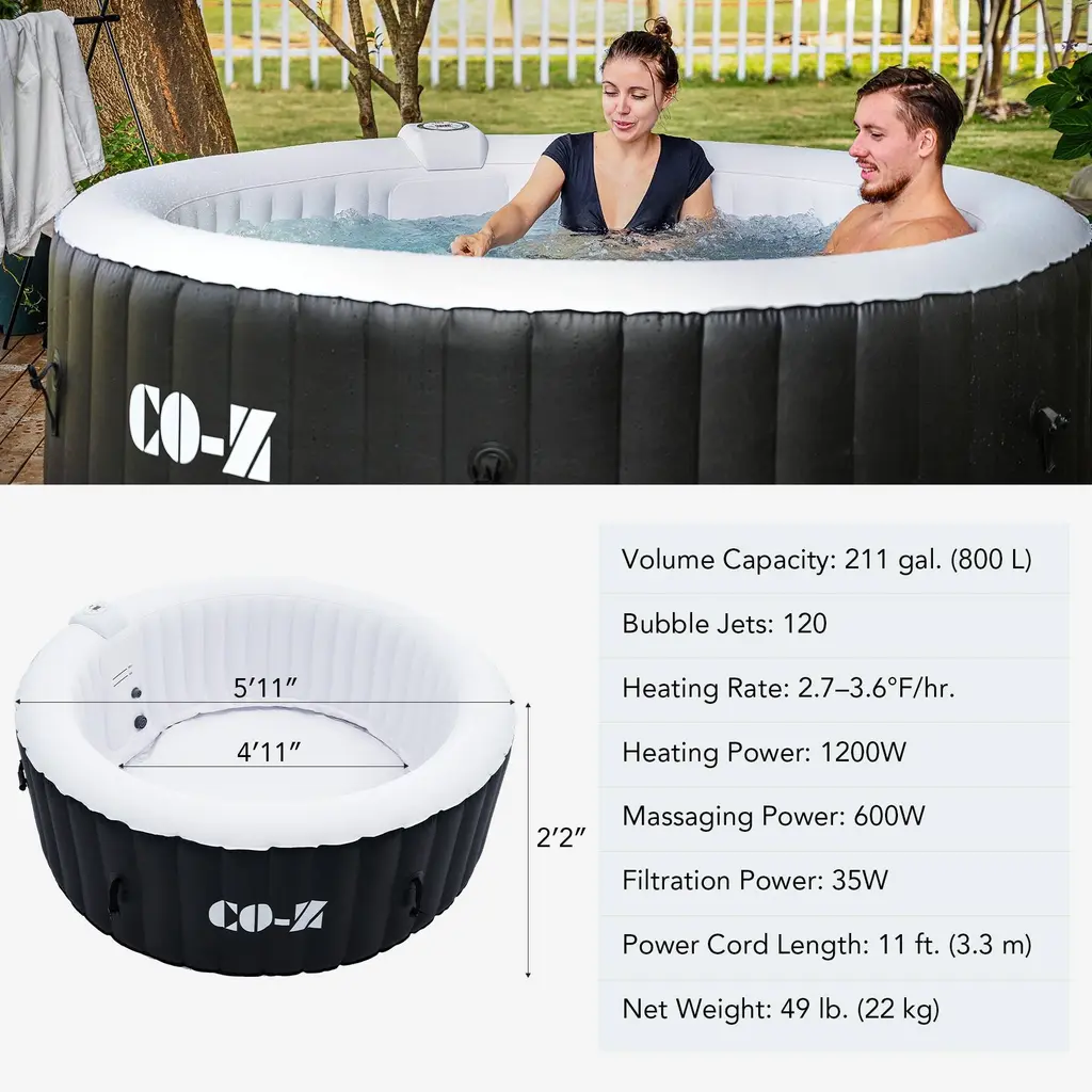 Experience the ultimate relaxation with CO-Z Round Inflatable Hot Tub, the perfect addition to your backyard oasis. With its durable PVC build, intuitive control panel, and rejuvenating bubble jets, this 6-foot-wide hot tub accommodates up to four adults, offering you and your loved ones a true-to-spa experience in the comfort of your own home. Its fitted cover and two filter cartridges make maintenance a breeze, while the built-in drain ensures quick and easy water removal. Create memories and unwind with CO-Z's portable hot tub.Features:
