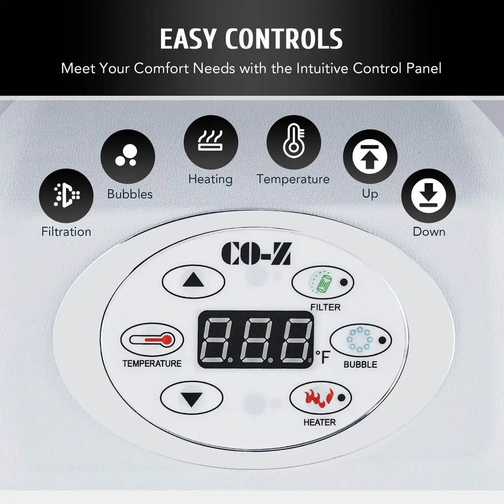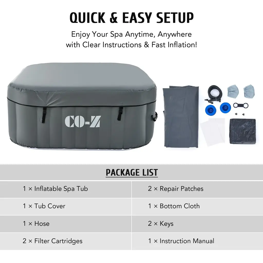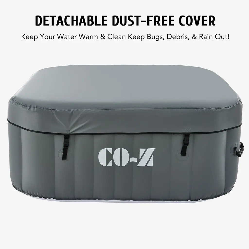 Experience the ultimate relaxation with the CO-Z Square Inflatable Hot Tub, a blow-up portable hot tub that accommodates up to 4 adults. With powerful bubble jets and adjustable settings, you can create a customized spa experience right in your own backyard. Made with durable PVC material, this puncture-proof mini pool includes a fitted cover and 2 filter cartridges for easy maintenance. When you're ready to drain and store it away, the built-in valve makes it a breeze.Features: