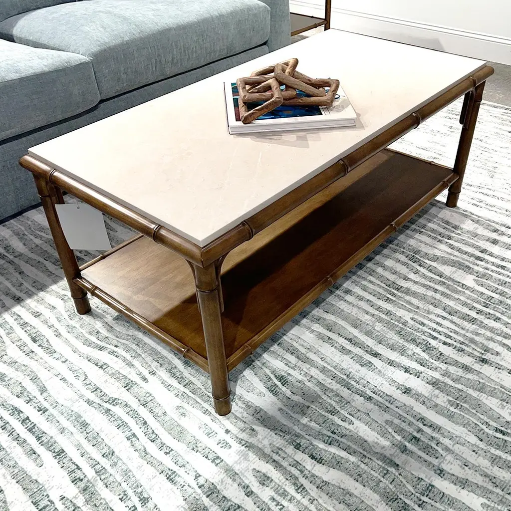 This beautiful piece features a masterfully carved faux bamboo frame that brings a touch of tropical charm to any room. With a cast-textured concrete top that adds a contemporary twist and provides a durable surface. The spacious lower shelf offers convenient storage for books, magazines, or decorative accents, making it as functional as it is stylish. With its light, natural finish, this table perfectly complements coastal, boho, or eclectic interiors. Dimensions: 48" W x 24" D x 20" H
