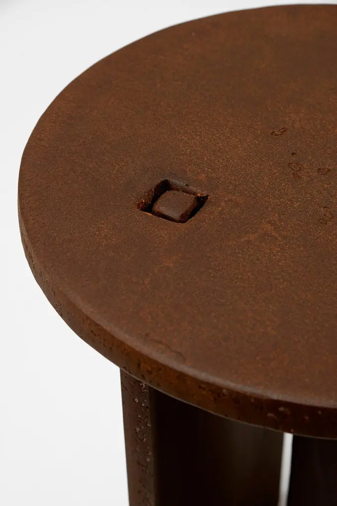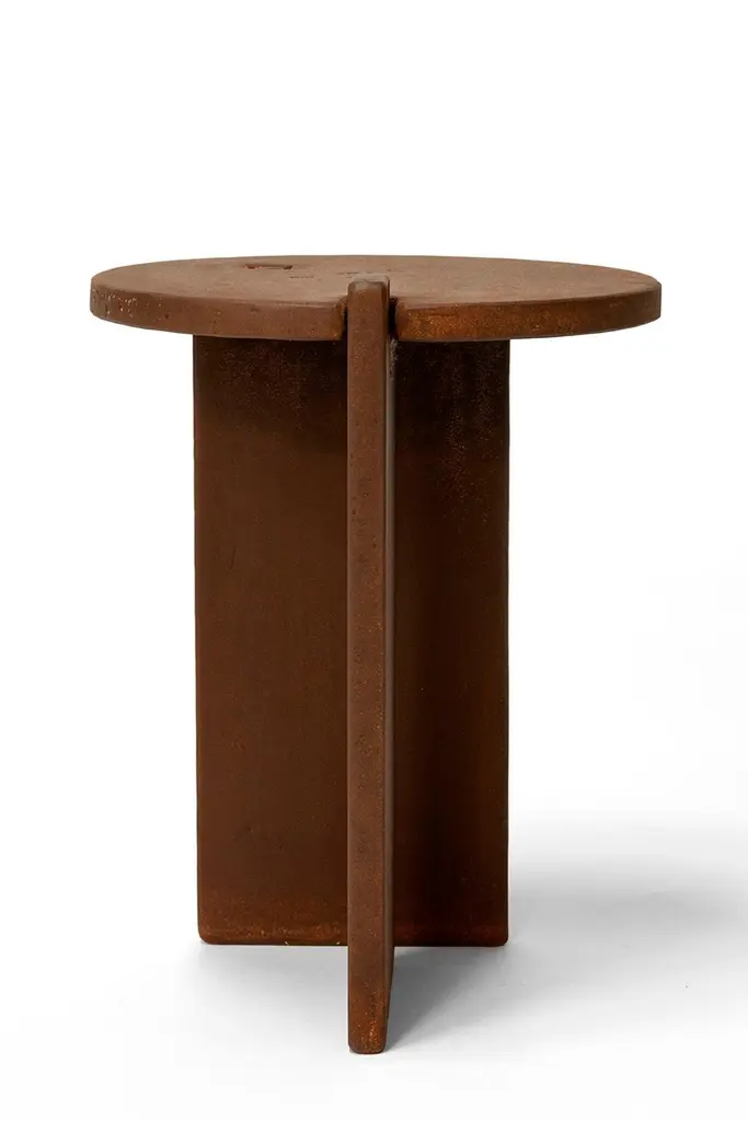 Table No. 8 - Stool or side tableJ.M. Szymanskid. 2021A perfectly simple stool or side table. Solid 3/4” steelcomponents are combined to make a dynamic form. Custom sizes and finishes available. Made in New York City.Our products are fabricated and finished by hand, so variations in size, shape, and patina color are a natural result of this process. Tooling marks and surface scratches are part of the character of many finished pieces. All products are sealed with oil and wax, which, over time, are not impervious to moisture. Our blackened steel pieces installed outside or in areas exposed to moisture indoors, especially in marine environments, will rust. Condensation from hot and cold drinks will leave rings on blackened steel table tops. Coasters or placemats can protect the finish. Periodic maintenance of blackened steel items may be required.
