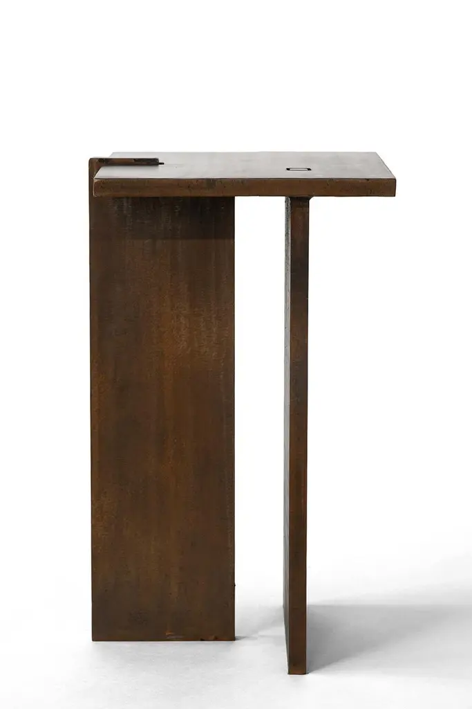 TABLE NO. 8 - SQUAREJ.M. Szymanskid. 2023A perfectly simple side table. Solid 3/4” steel components are combined to make a dynamic form. Featured in bronze steel finish.Custom sizes and finishes available. Made in the Bronx, New York, USA.Our products are fabricated and finished by hand, so variations in size, shape, and patina color are a natural result of this process. Tooling marks and surface scratches are part of the character of many finished pieces. All products are sealed with oil and wax, which, over time, are not impervious to moisture. Our blackened steel pieces installed outside or in areas exposed to moisture indoors, especially in marine environments, will rust. Condensation from hot and cold drinks will leave rings on blackened steel table tops. Coasters or placemats can protect the finish. Periodic maintenance of blackened steel items may be required.