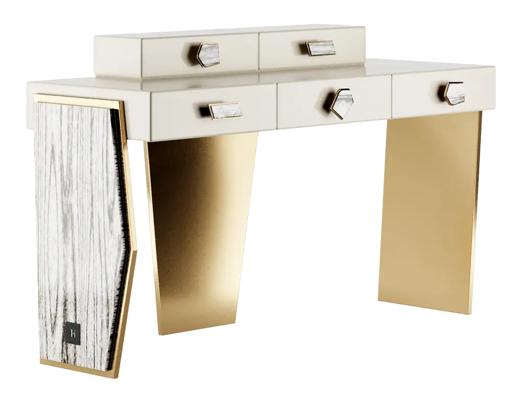 Functional yet chic, this striking vanity table is the perfect bedroom accessory for the modern woman. Made entirely of wood, the tapered legs, base, and top have a modern grey finish, while the drawer units of beige lacquered wood boast a sophisticated pattern with fluted shafts that is the trademark of the Cocoon collection. The drawers, one small and one large on each side, have a leather handle and red interiors, while the top hides a panel that flips open to reveal a mirror and storage compartments. The streamlined silhouette makes this piece adaptable in traditional and modern decors.