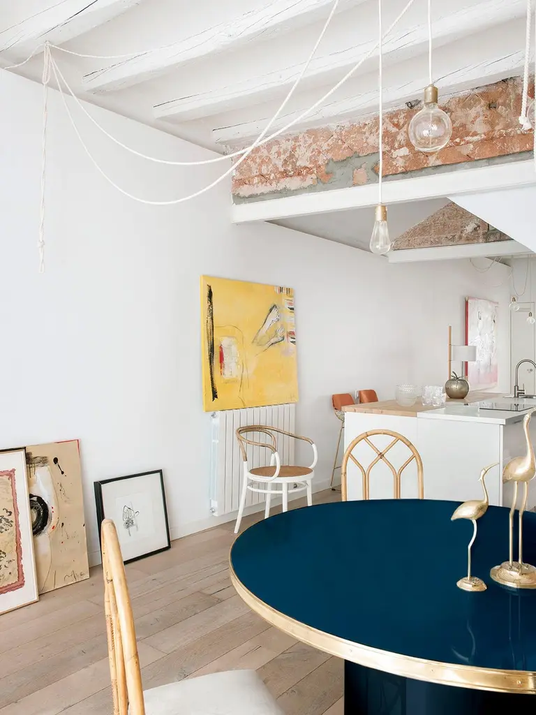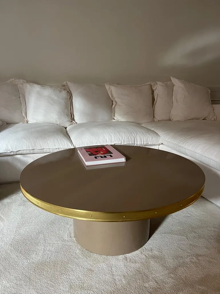 Julieta Collection. Coffee Table High Gloss Laminated Top Brass Tape Framed Black Pedestal Base Medium SizeIntroducing the stunning console table with black powder-coated steel construction, boasting sleek conical legs with brass accents at the bottom. The table top features a high gloss laminate finish, available in a variety of colors to suit your taste and style. The mid-century modern influence is evident in the brass tape frame that adds a touch of sophistication and elegance.This exquisite table is perfect for various settings, including hospitality venues such as hotels, restaurants, and bars, as well as offices or private residences. Designed and fully manufactured in Spain, each piece is meticulously crafted to order, ensuring exceptional quality and attention to detail.The conical legs not only provide stability but also add a touch of contemporary flair, making this dining room table a statement piece in any space. The black powder coating on the steel gives it a sleek and modern look that complements the overall design. The brass accents on the legs add a touch of opulence, elevating the table's aesthetic appeal.The table top is made from high gloss laminate, which not only adds durability but also gives it a lustrous finish that catches the eye. The multiple color options for the table top allow you to choose the perfect hue to match your interior decor. The brass tape frame adds a touch of timeless elegance and serves as a visual highlight that sets this table apart.With its unique blend of mid-century modern style, meticulous craftsmanship, and versatility, this dining room table is a true masterpiece that exudes sophistication and style. Whether it's for entertaining guests in a chic restaurant or adding a touch of elegance to your private residence, this table is sure to make a statement in any setting. Don't hesitate to inquire about specific dimensions, as each piece is made to order, ensuring a perfect fit for your space. Elevate your dining experience with this exceptional dining room table with conical legs, designed to impress and built to last.