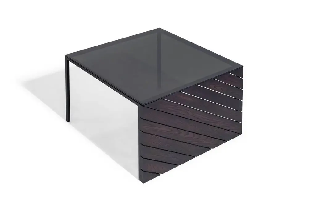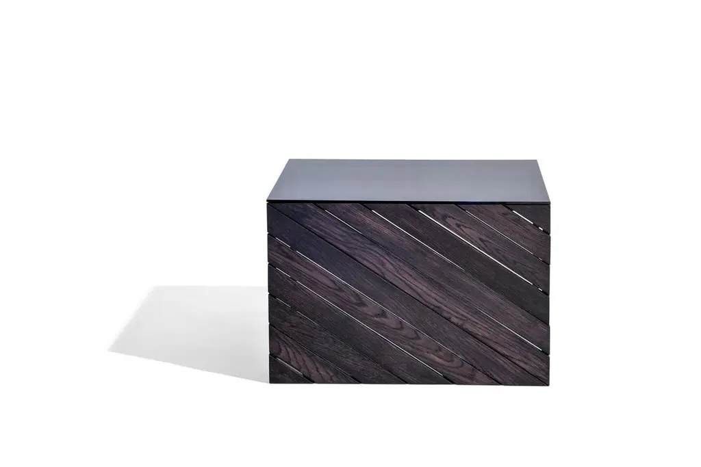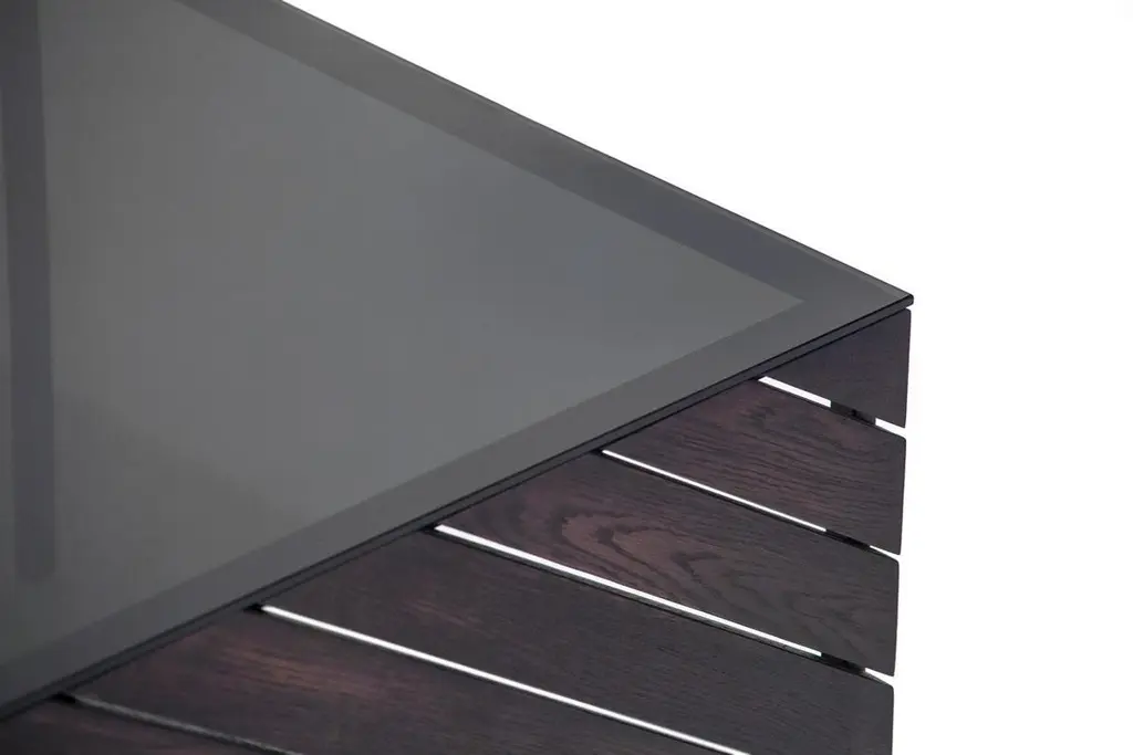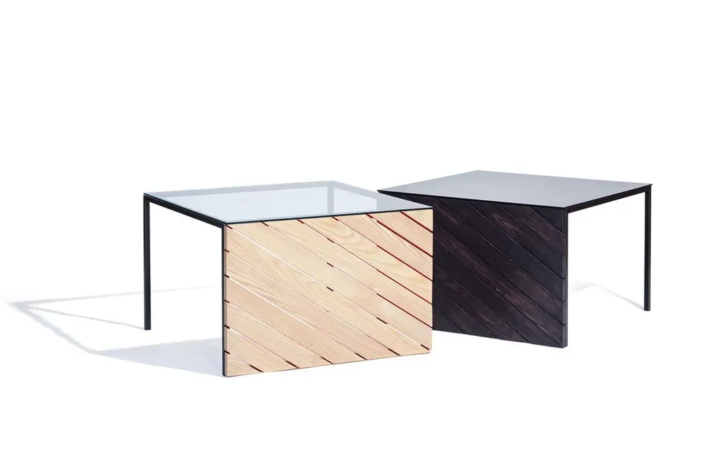 With one “Good Side,” this 24" square glass-top coffee table is minimalism that demands attention. Diagonal FSC-certified ash slats reveal light through the gaps in either matte black or bright pink lacquer finishes. Good Side's 1/4” tempered glass surface in clear or ultra-gray gives the slats presence from any angle, lending a custom designed feel to any space it occupies. The black steel frame is powder-coated in a low-VOC matte finish and the ash is hand polished with water-borne polyurethane and natural beeswax.See 1stdibs listing LU314439081953 for natural ash with pink detail and clear class option.Please contact Hinterland Design to discuss other customization options. Hinterland designs and manufactures each of their pieces in its Vancouver, Canada workshop.