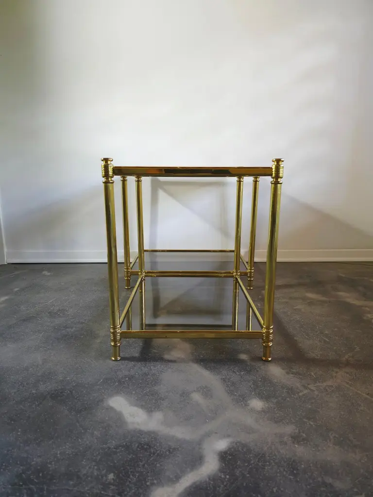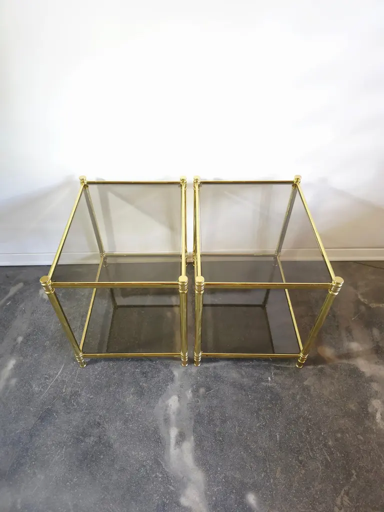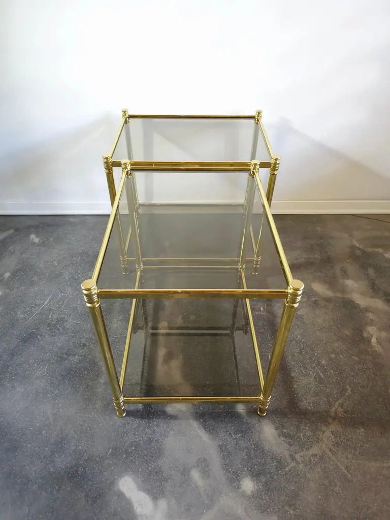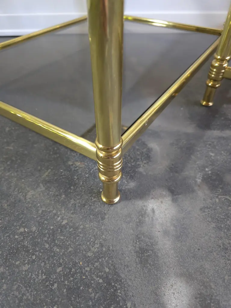 Coffe/End Table 1970sBeautiful table with smoked glass and brass.Patina due to age, nice contribution to brighting up a living space.Price is for one.
