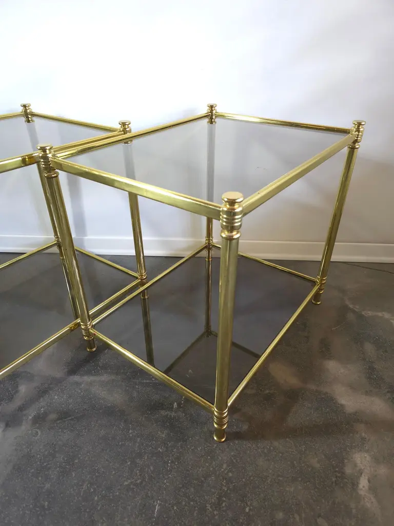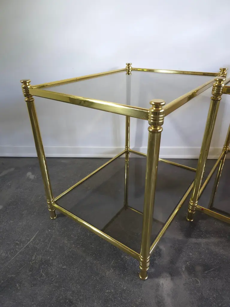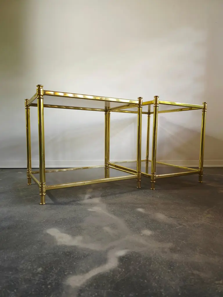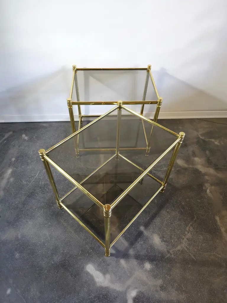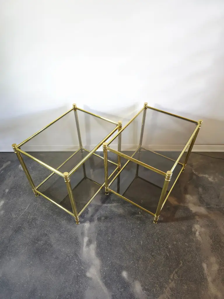Coffe/End Table 1970sBeautiful table with smoked glass and brass.Patina due to age, nice contribution to brighting up a living space.Price is for one.