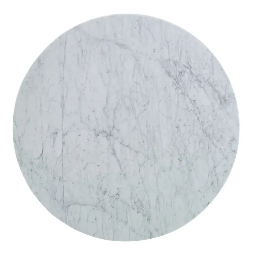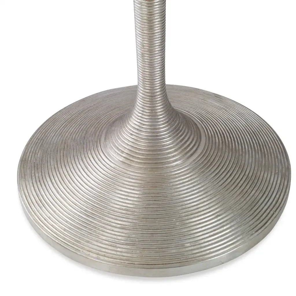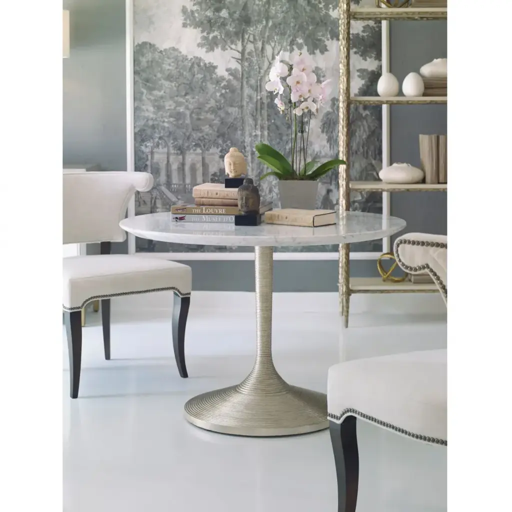 This breakfast table features an antique silver leaf base and pedestal with a unique coiled like pattern. The top is polished Carrera marble.
