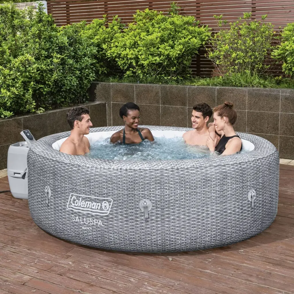 After a long day, nothing is more relaxing than sinking into warm, bubbling water in your backyard. The spacious, round design of the Coleman Sicily Hot Tub provides a soothing massage experience for up to 7 people. Simply attach the pump and watch as it inflates. Featuring an AirJet system with 180 jets, this hot tub releases bubbles from the bottom of the spa to create a warm, bubbling hot tub environment. These calming bubbles will help you relax and unwind from the comfort of your home. Whether you're seeking a solitary escape or hosting a gathering of friends, this spa caters to your every need. Built with durable DuraPlus materials to avoid damage, you can ensure this hot tub retains its shape after repeated inflation and deflation. Including a FreezeShield with an automatic heating function, this hot tub's inner components will not freeze during colder temperatures. The true game-changer is the included EnergySense Cover, which not only ensures the water remains at the ideal temperature but also conserves energy, making it a great choice. With a simple touch, you can transform your space into a private oasis where worries dissipate. Including 2 built-in cupholders and a reinforced, insulated pool cover that locks in heat while not in use, you can be sure this spa is ready for when you are. Escape away to loosen your muscles with the Coleman Sicily 7-Person Inflatable Hot Tub Spa. ELECTRICAL SAFETY: Do NOT use an extension cord or multi-plug adaptor; plug the hot tub directly into a grounded socket corresponding to the electrical rating of the attachment plug (110-120V AC, 60Hz, Single Phase 12A at 68ºF). Outdoor installation is preferred; indoor installation has special requirements