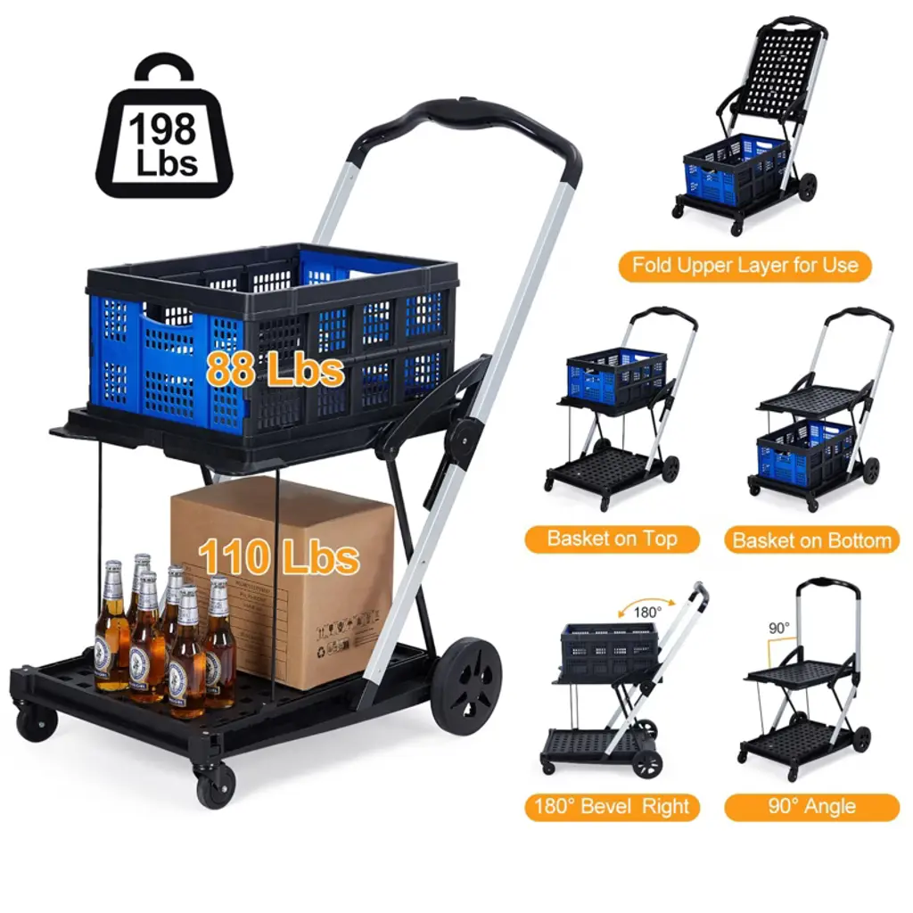 Collapsible Shopping Cart, Foldable Grocery Cart with Wheels and Removable Storage Crate, 2-Tier Portable Utility Cart for Home, Groceries, Supermarket