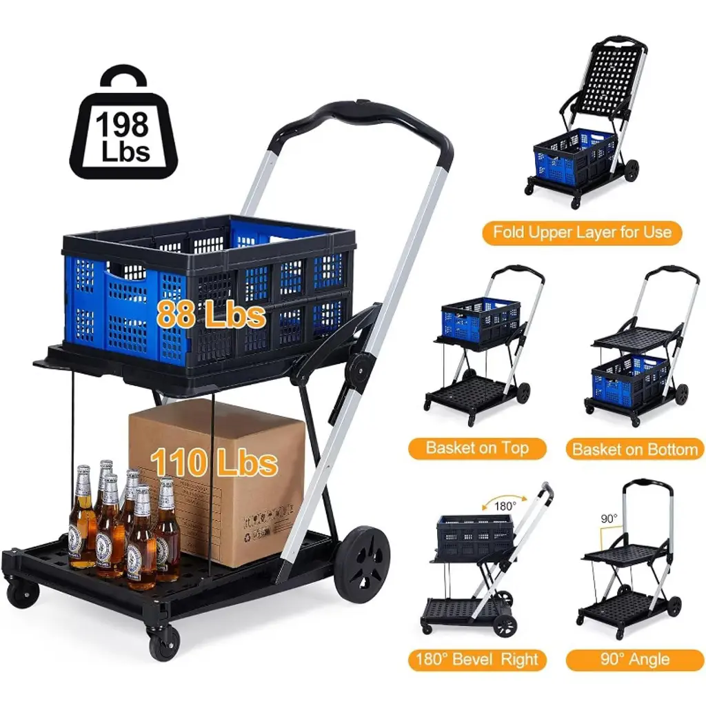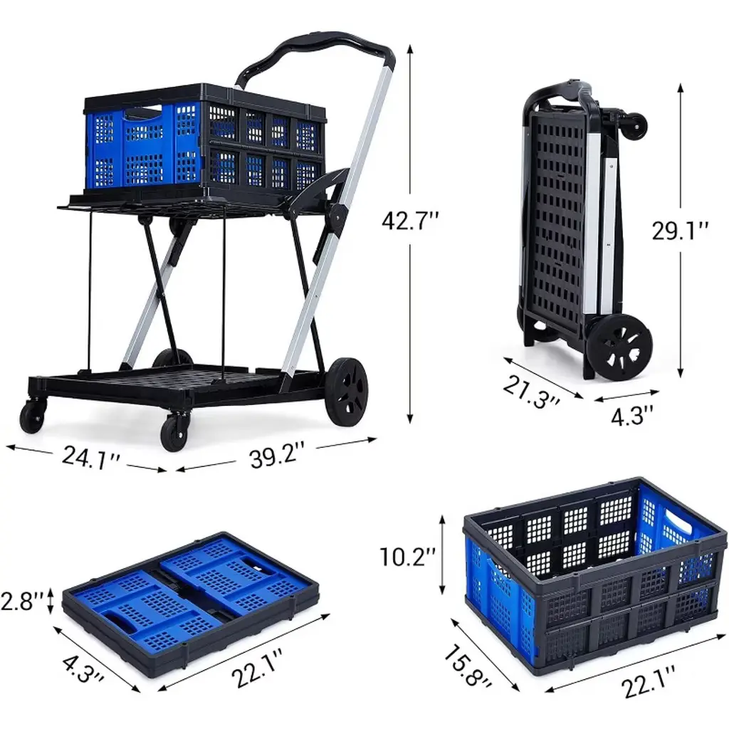 Collapsible Shopping Cart, Grocery Cart With Wheels And Removable Storage Crate, 2-tier Portable Utility Cart For Home, Groceries, Supermarket, Blue