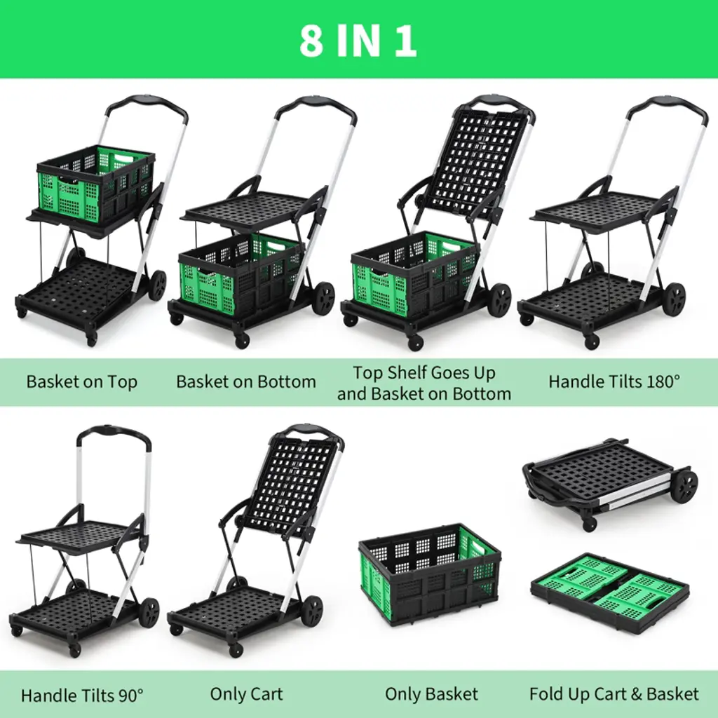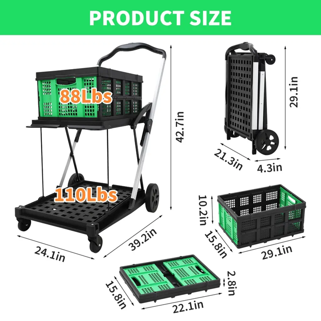 Collapsible Shopping Cart, Grocery Cart With Wheels And Removable Storage Crate, 2-tier Portable Utility Cart For Home, Groceries, Supermarket, Green