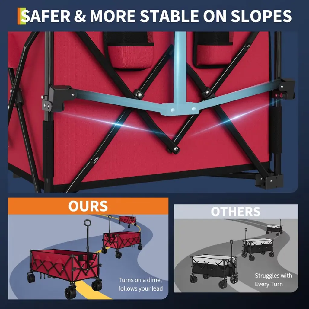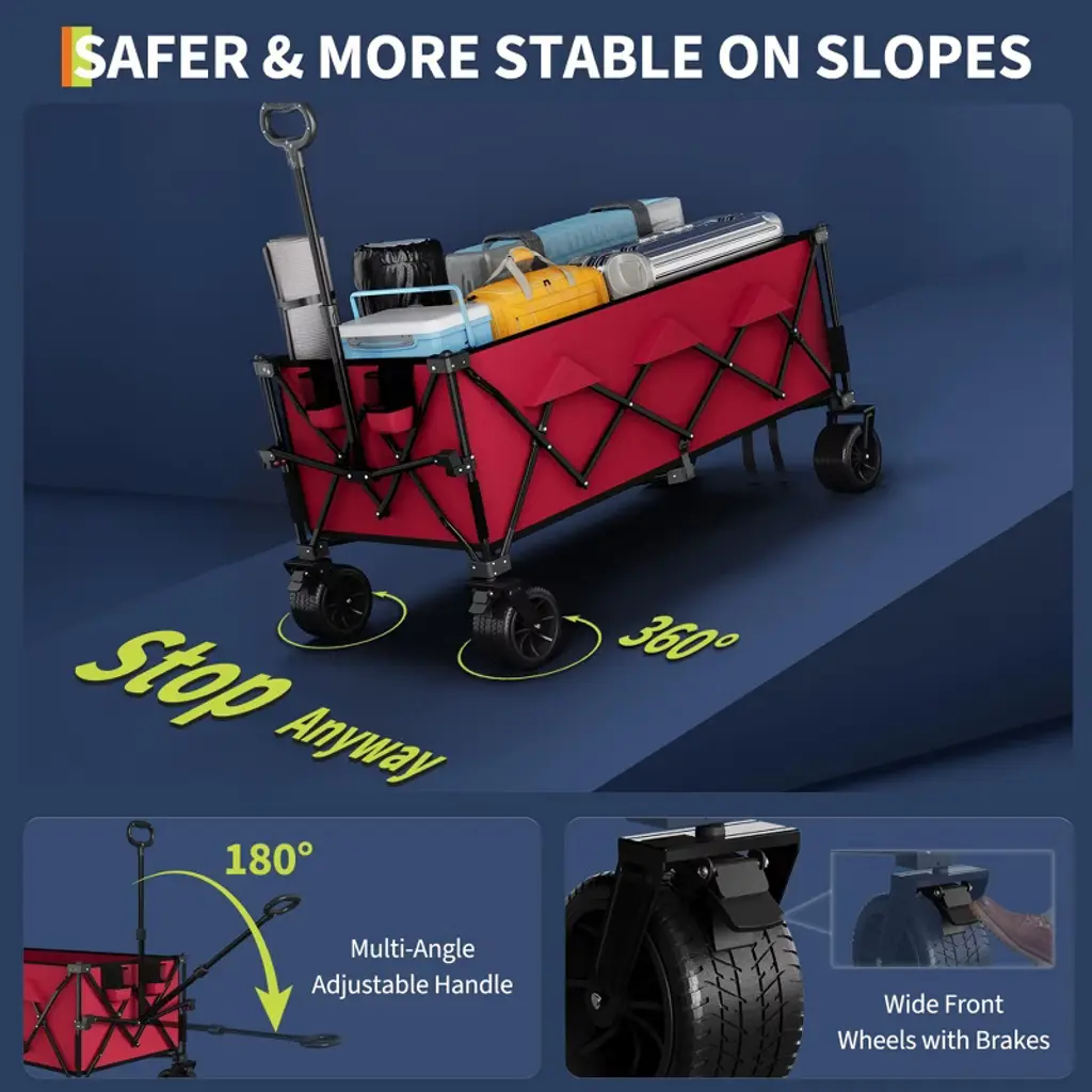 Make every adventure easier with this collapsible utility wagon cart, built for strength and convenience. It features a robust steel frame and durable fabric to handle heavy loads up to 460 lb. The wagon folds down compactly with a built-in carry handle, saving storage space in your car or closet. Oversized all-terrain wheels and an adjustable handle guarantee smooth movement and easy handling whether you're at the beach, grocery store, or campsite.