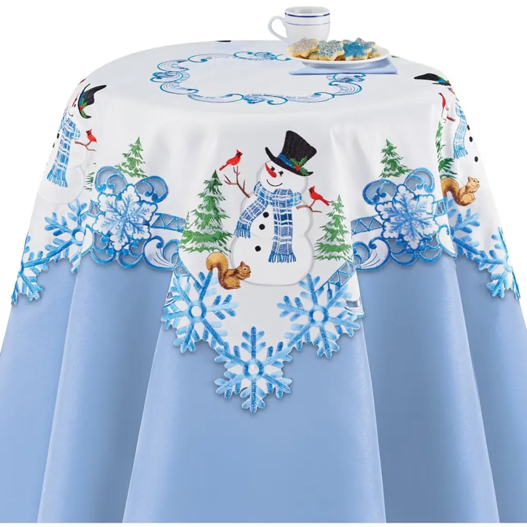 This Charming Snowman Table Linen Design Includes A Border Of Beautiful Blue Snowflakes. They're Perfect On Their Own Or With A Coordinating Tablecloth Underneath (Sold Separately). Machine Wash. Polyester; Imported. Choose: Runner (67 1/2"L X 13 1/2"W) Or Square (33 1/2"Sq.).
